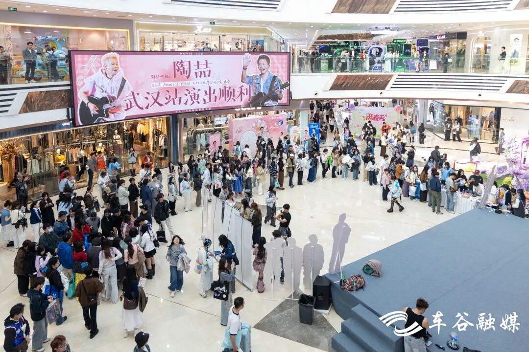 场内歌迷万人大合唱,场外购物中心、酒店也开启“宠粉”模式。武汉体育中心对面的经开万达广场,开展“樱为喆里”陶喆歌迷会应援活动,成为众多歌迷的“一站式补给站”。广场中庭设置应援大屏与签到墙,开设主题打卡点,提供周边与应援福利,吸引大量观众驻足,广场同步推出歌迷专属折扣餐饮福利,覆盖饮品、中餐、烤肉、火锅、自助等品类。经开万达广场市场经理厉长威介绍,3月27日单日客流量和销售额均创新高,同比实现大幅增长。