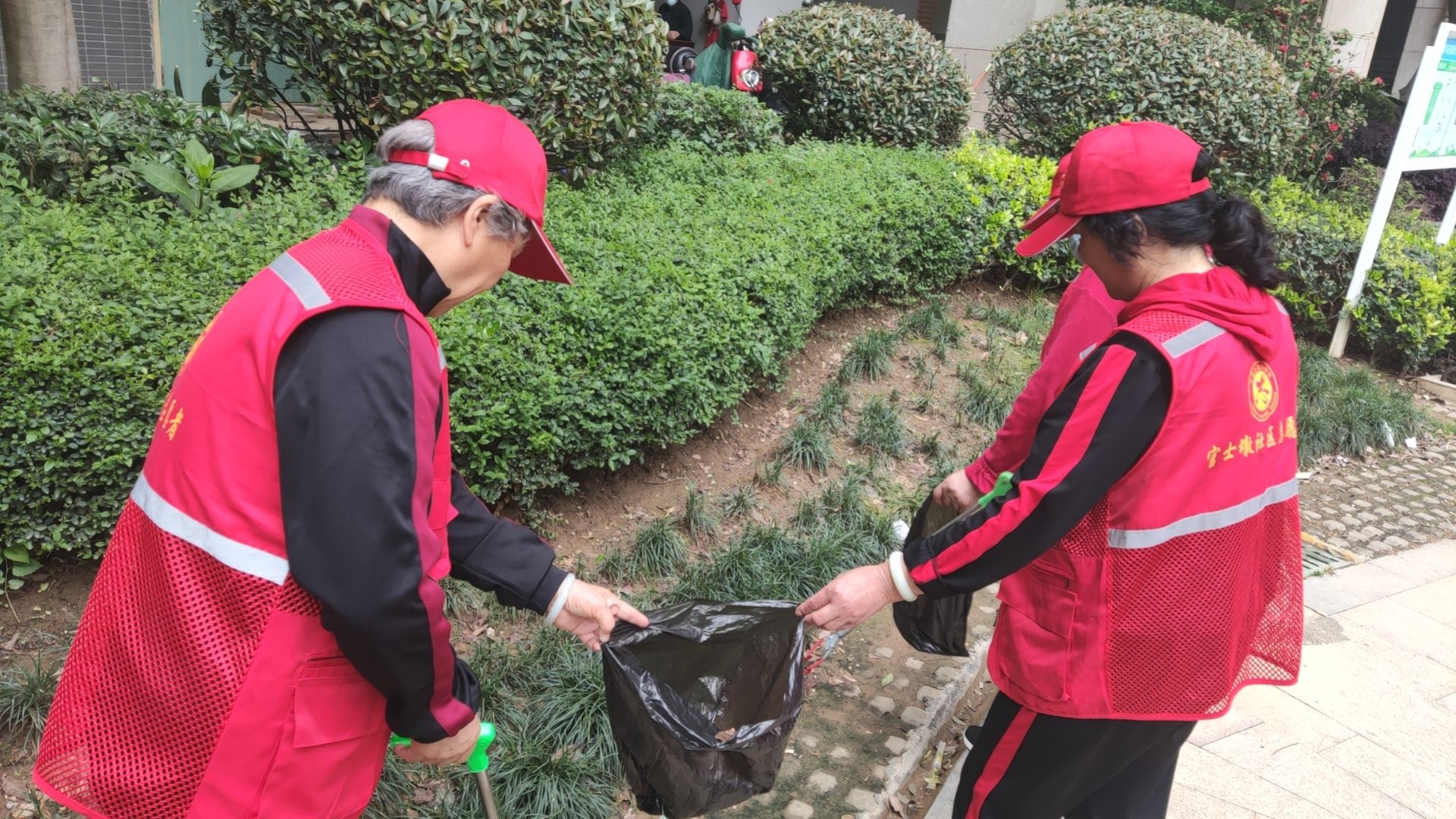 活动现场,志愿者们身穿红马甲,手拿拾便袋、铲子,分组清理小区路面杂物和犬便,一个个红色的身影或是弯腰捡起白色垃圾,或是用铲子清理草坪上遗留的犬便。