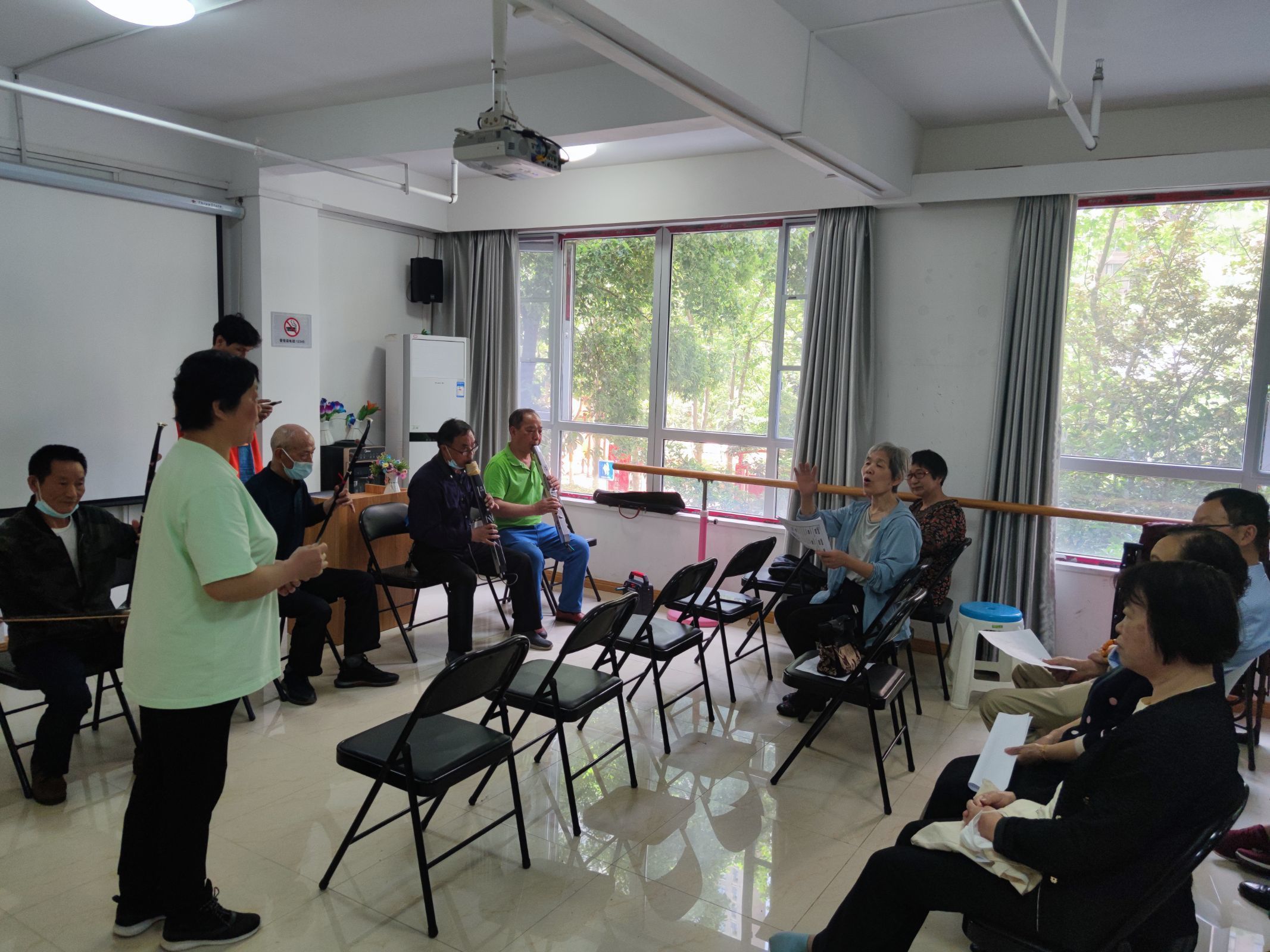 “洪湖水呀,浪呀嘛浪打浪啊……”一阵悠扬的乐器合唱从社区的活动室中传来,原来是观澜社区的“老年明星合唱团”在为社区图书室的主题活动做现场表演。大家共同演奏合唱,各种乐器声交织在一起,旋律跌宕起伏、热情激昂,拉开了本次读书分享会序幕。随后,志愿者同大家一起认真阅读学习了党的二十大报告。