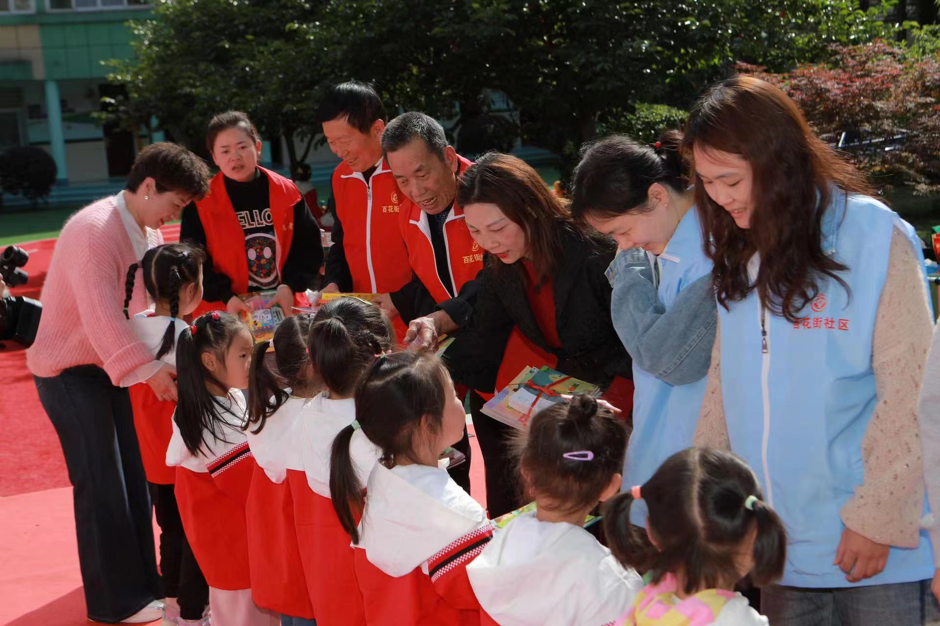 在“赠书筑梦”环节,百花街社区向幼儿园捐赠了总计60多套书本文具,社区“映山红党员志愿服务队”的志愿者们为小朋友讲解了“全民读书日”的由来,并声情并茂地讲述了红色故事。社区将一本本图书送到幼儿园的教师和小朋友手中,老师和孩子们的脸上洋溢着灿烂的笑容。