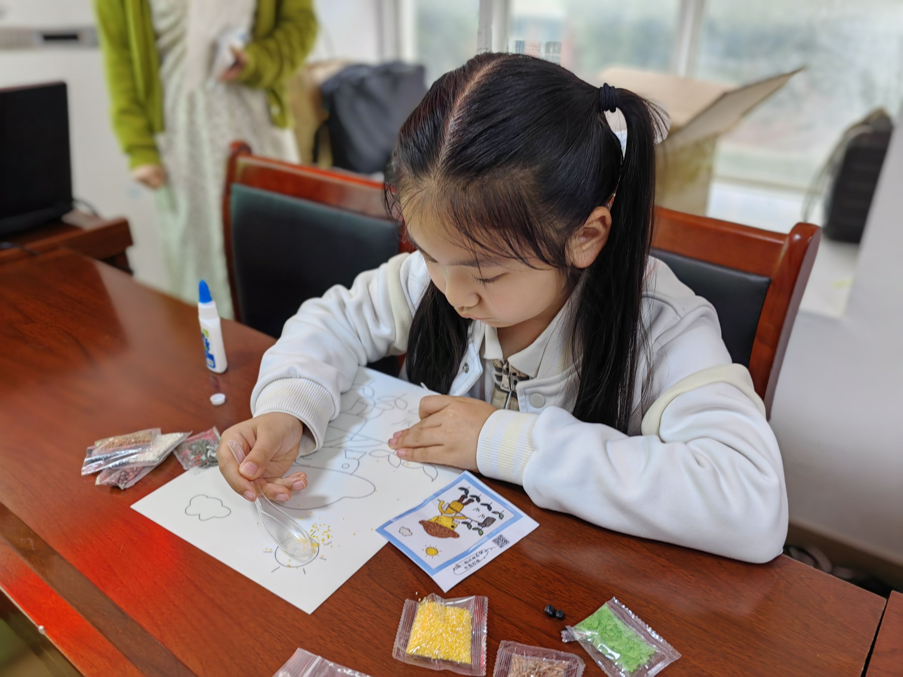 随后,小朋友们以镊子作“笔”,五谷为“墨”,或粘或贴,勾勾点点,巧妙地将五谷杂粮和艺术画作融合在一起。有的孩子用米粒塑造了农民伯伯耕种的忙碌景象、有的孩子巧用五谷绘制了环卫工人清扫的橙色身影、有的孩子拼制出妈妈做家务的画像……孩子们在创作中“沉浸式”感悟劳动之美。