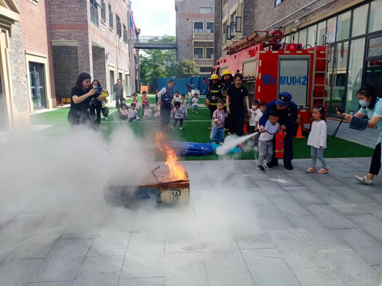 本次演练分为安全知识培训、现场示范、模拟火情、灭火逃生等环节。消防中队队员向小朋友们介绍了灭火器的正确使用方法、发生火灾事故后的基本扑救方法、自防自救措施等消防安全基本知识。