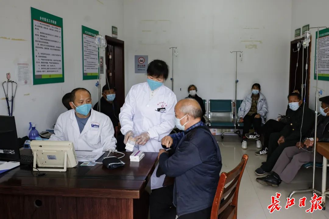 ▲10日,武汉经开区汉江村卫生室,刘志强(左)负责看病,万会(中)负责输液、拿药。长江日报记者胡冬冬 摄