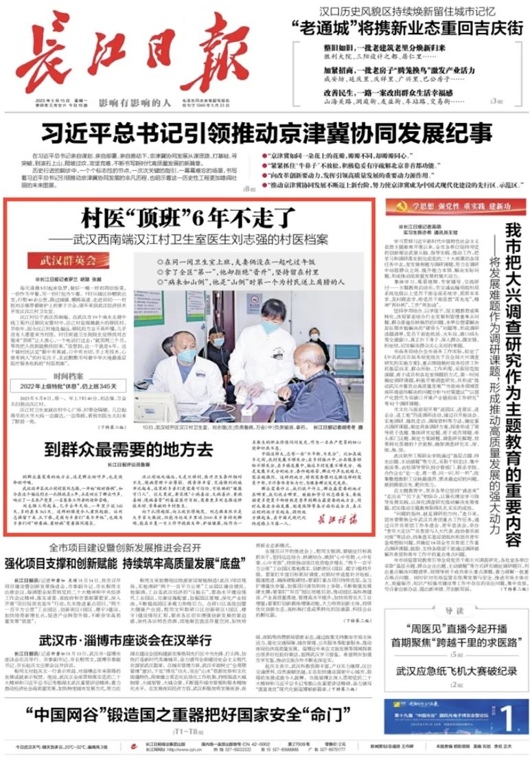 今天的长江日报头版“武汉群英会专栏”,报道武汉经开区汉江村村医刘志强扎根基层的感人事迹。“武汉群英会”栏目聚焦各条战线各个领域先进典型,讲述他们扎根平凡岗位的奋斗故事和高尚情怀,反映英雄城市、英雄人民奋发向上的精神风貌。以下为全文转载。