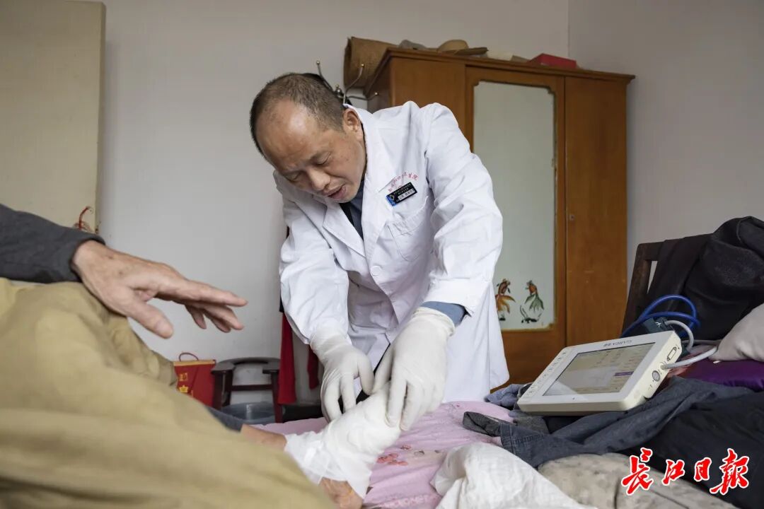 ▲3月8日,刘志强医生来到85岁老人唐贵荣家,查看老人脚部的恢复状况并为其消毒换药。长江日报记者胡冬冬 摄