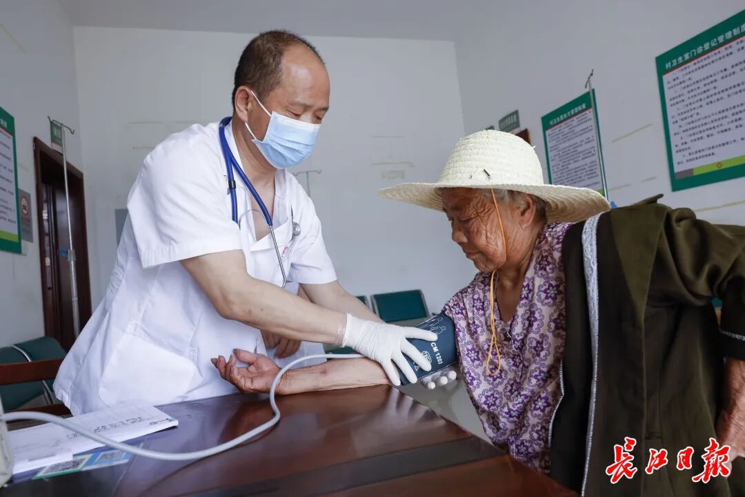 ▲汉江村卫生室,刘志强医生为村民量血压。长江日报记者胡冬冬 摄