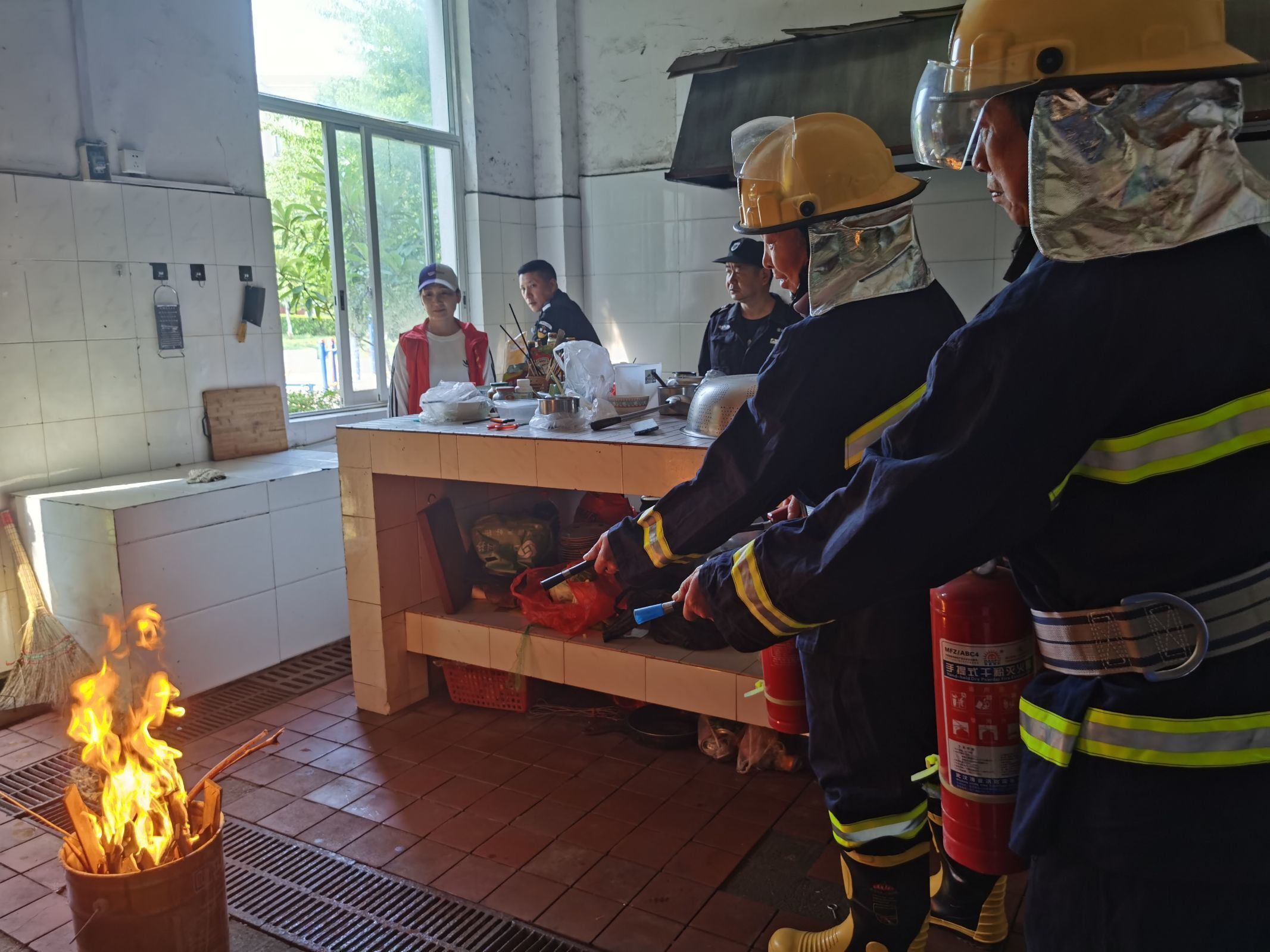 应急救援演练现场,模拟一楼物业食堂发生“火情”,物业安保人员紧急出动,快速疏散二楼活动室内的居民至安全地带。社区消防人员拿着灭火器向食堂奔赴,找到起火点在规定的时间内扑灭火源。