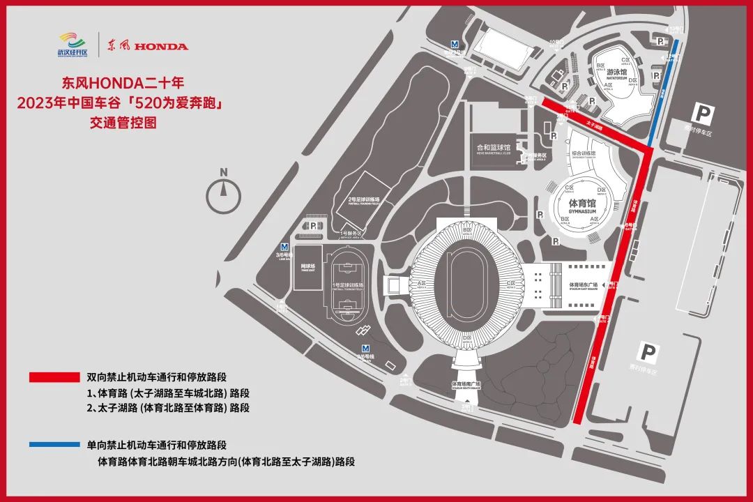 武汉体育中心主体育场跑道(起终点)-武汉体育中心靠近东广场4号门-武汉体育中心游泳馆12号门-武汉体育中心游泳馆11号门-中国车谷全民健身中心(北馆)7号门-途径武汉体育中心攀岩基地-途径中国车谷国际体育文化交流中心-武汉体育中心1号通道进。