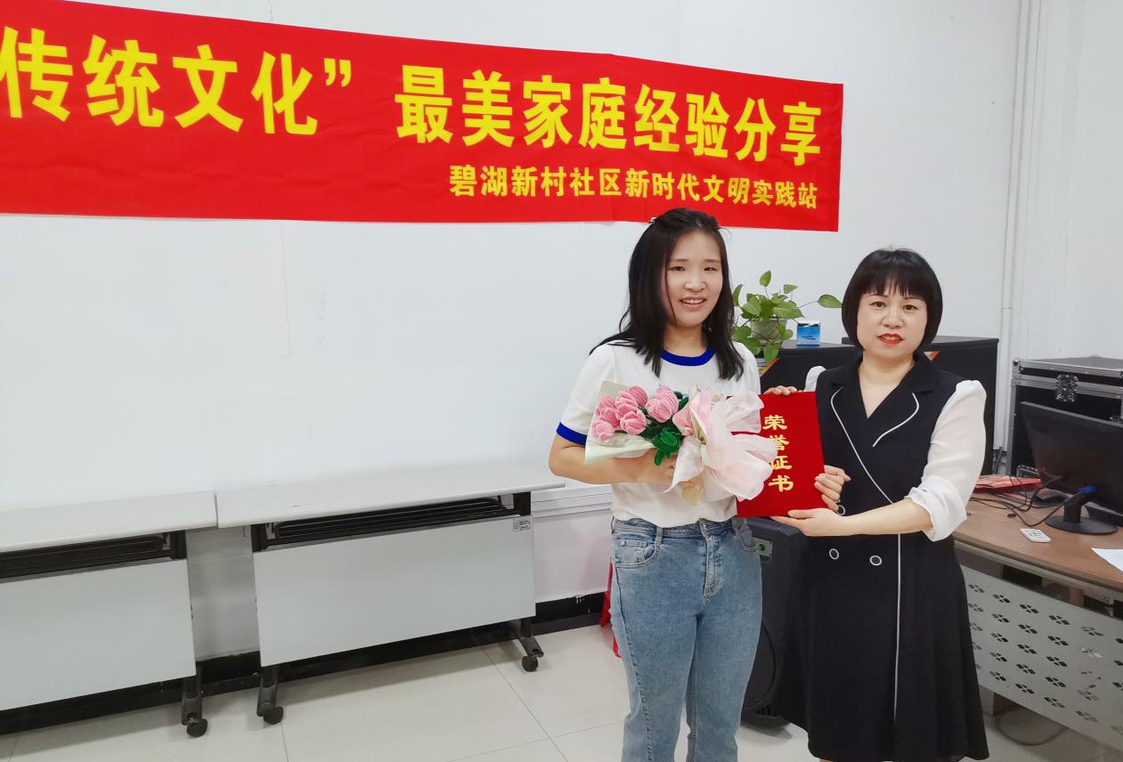 活动现场,武汉市“最美家庭”居民家庭代表邹莹,用朴实的语言、生动的事例向大家分享了家庭成员间和睦相处、日常生活中敬老孝亲的家风故事。社区居委会副主任代表社区颁发获奖荣誉证书,并号召广大社区居民向“最美家庭”学习,共建碧湖新村文明社区。