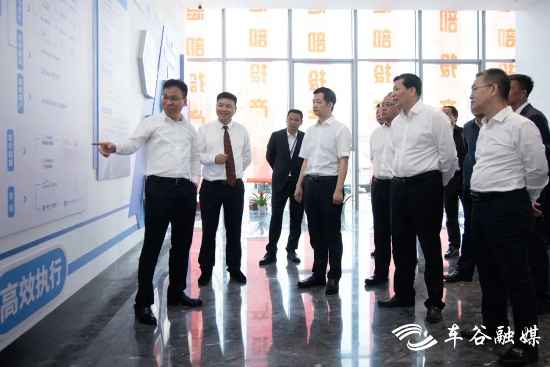 市委常委、武汉经开区工委书记刘子清与江河集团董事长刘载望一行座谈交流。工委副书记、管委会主任唐超出席投产活动并为江河集团华中总部基地投产推杆。