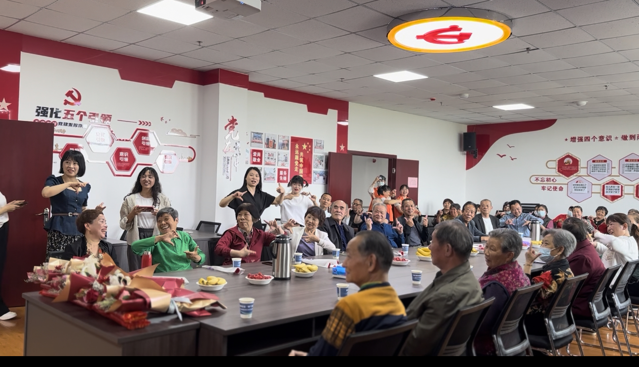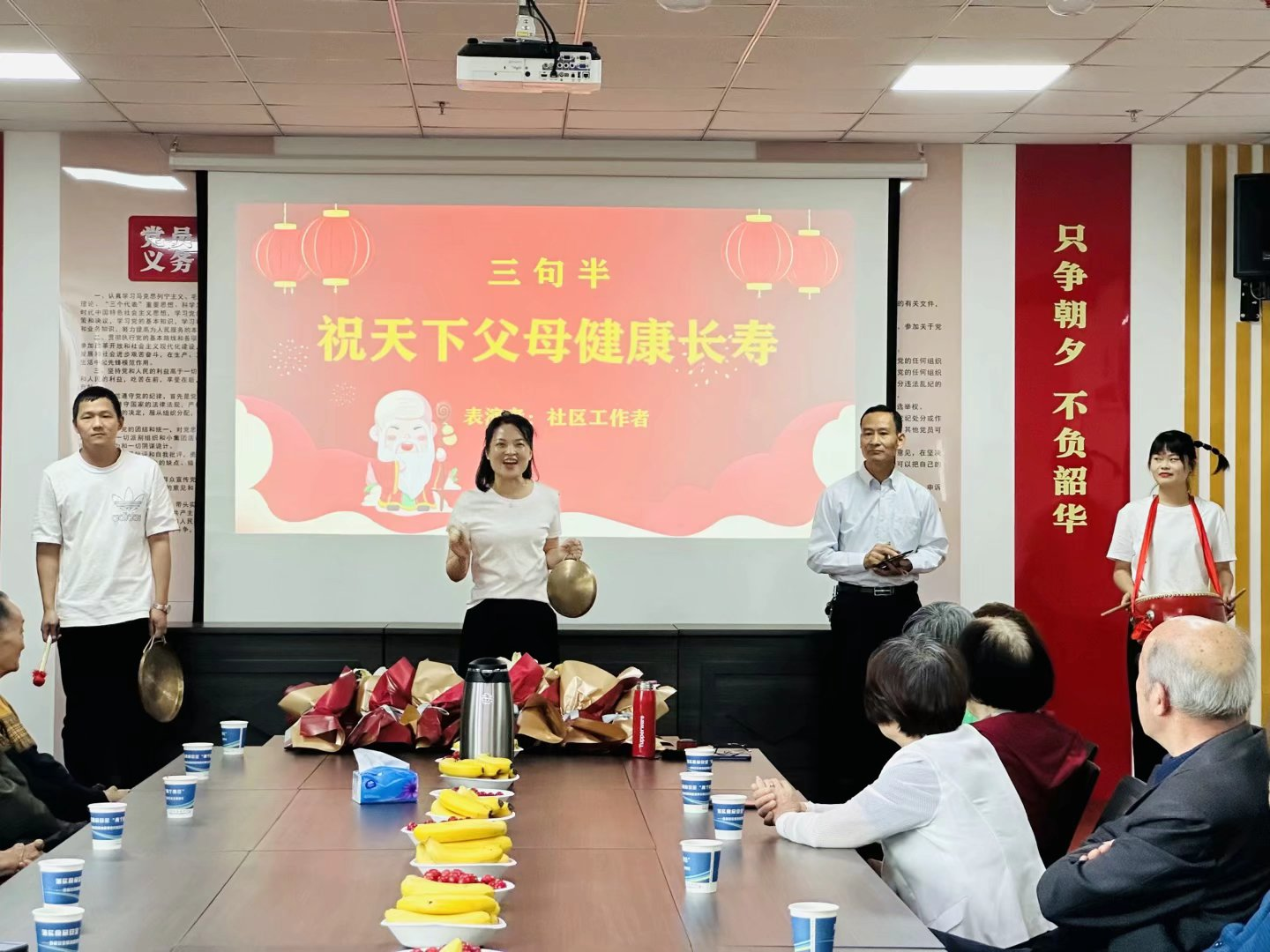 活动伊始,社区第二届老年协会熊会长向寿星们送祝福贺词,伴随一首《时间都去哪了》,现场的爷爷奶奶们陷入深深的回忆。随后,社区志愿者团队用接地气的方言为大家带来“三句半——祝天下父母健康长寿”,协会成员徐四毛献唱《向往神鹰》,将现场氛围推向高潮。