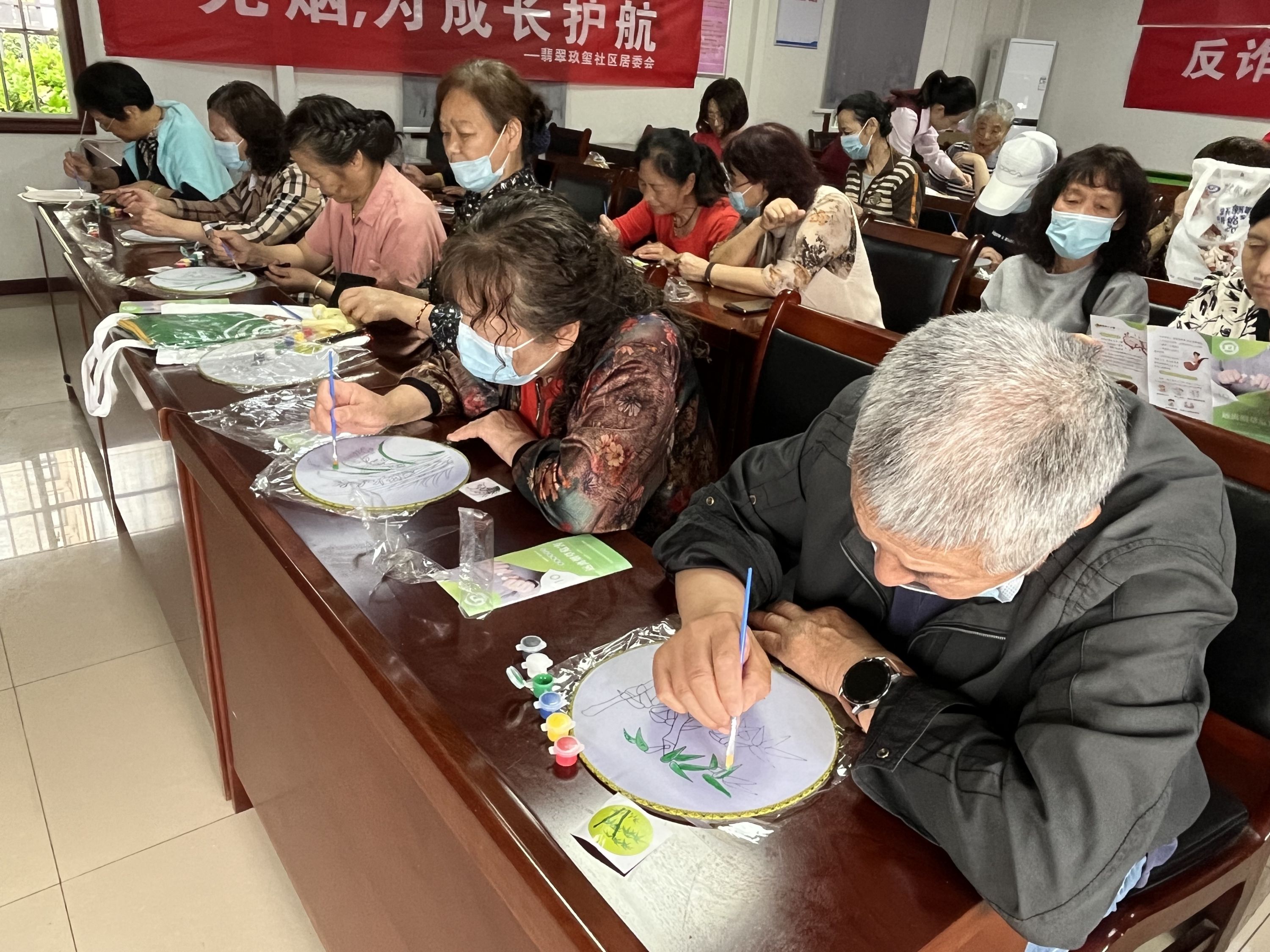 团扇DIY手绘活动现场,社区工作人员介绍了团扇的深厚文化艺术内涵以及手绘团扇的步骤、绘制要点、色彩搭配等知识及手绘制作流程,引导大家在扇面上进行绘画创作。