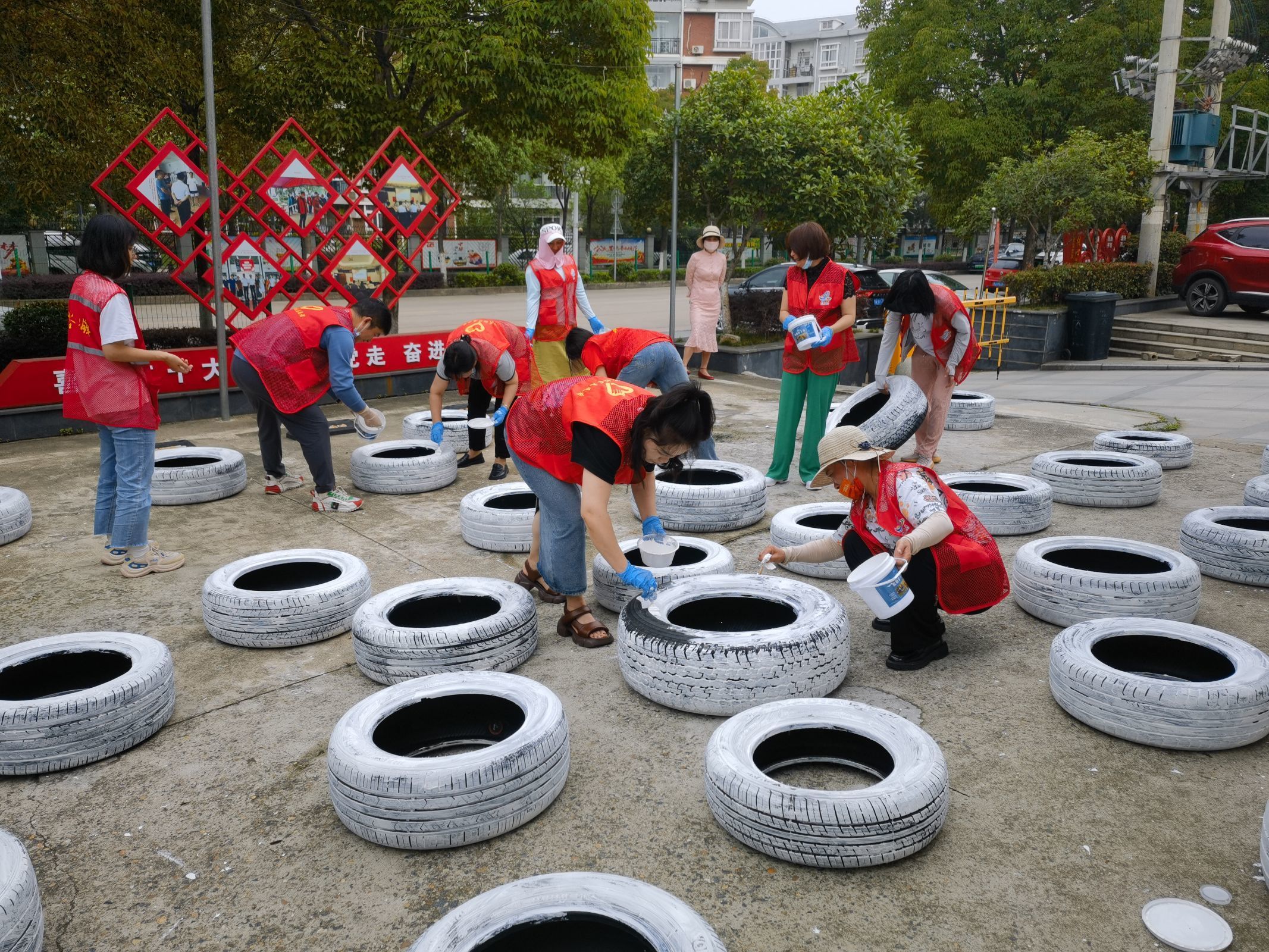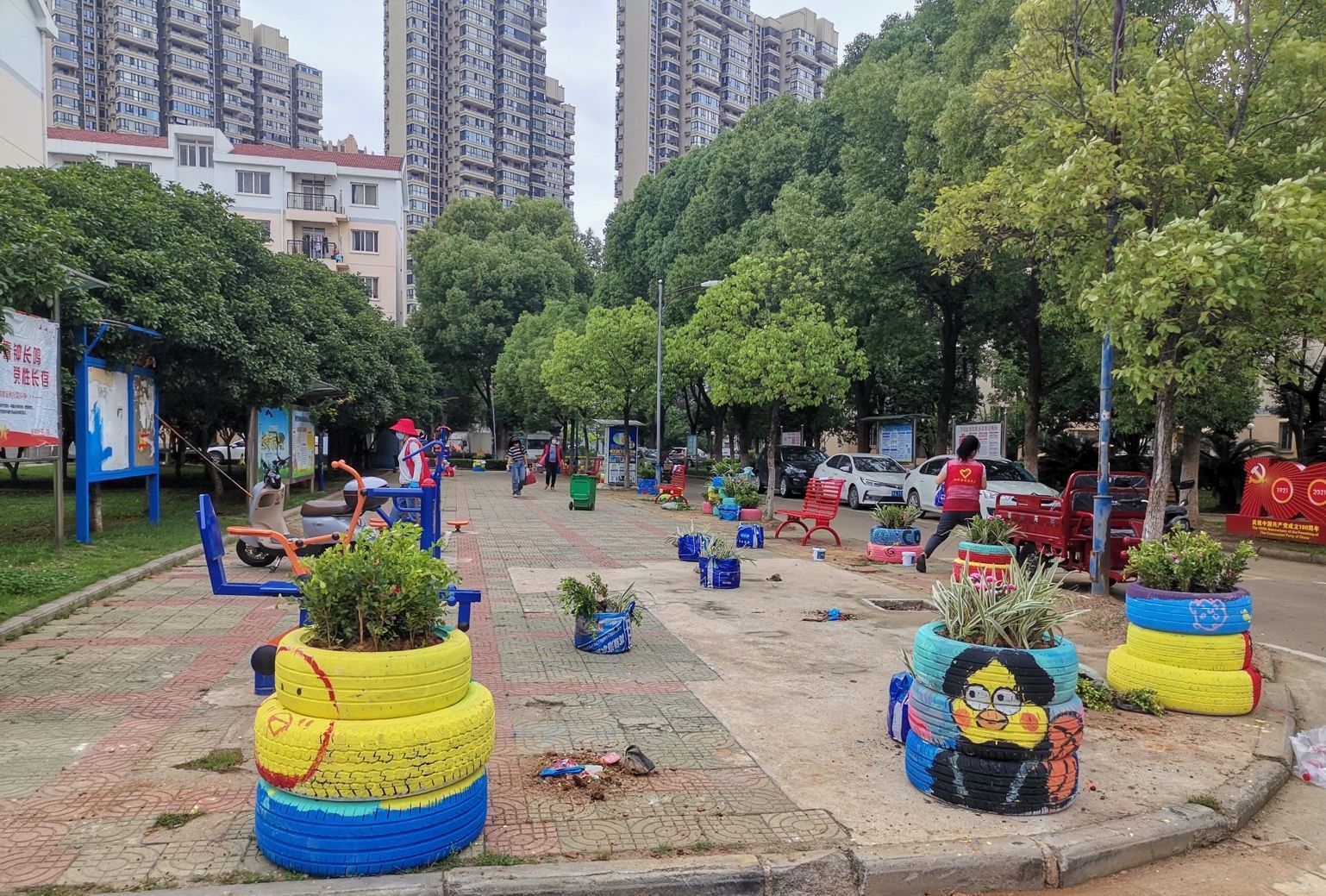 待所有作品全部出炉后,志愿者们将其摆放到合适的区域,装满肥土种上绿植,五彩斑斓的彩绘轮胎配上充满活力的绿植,使原本平平无奇的区域变成了有文化品位、创意特色和实际功效的社区微景观,在小区里成了一道靓丽的风景线。