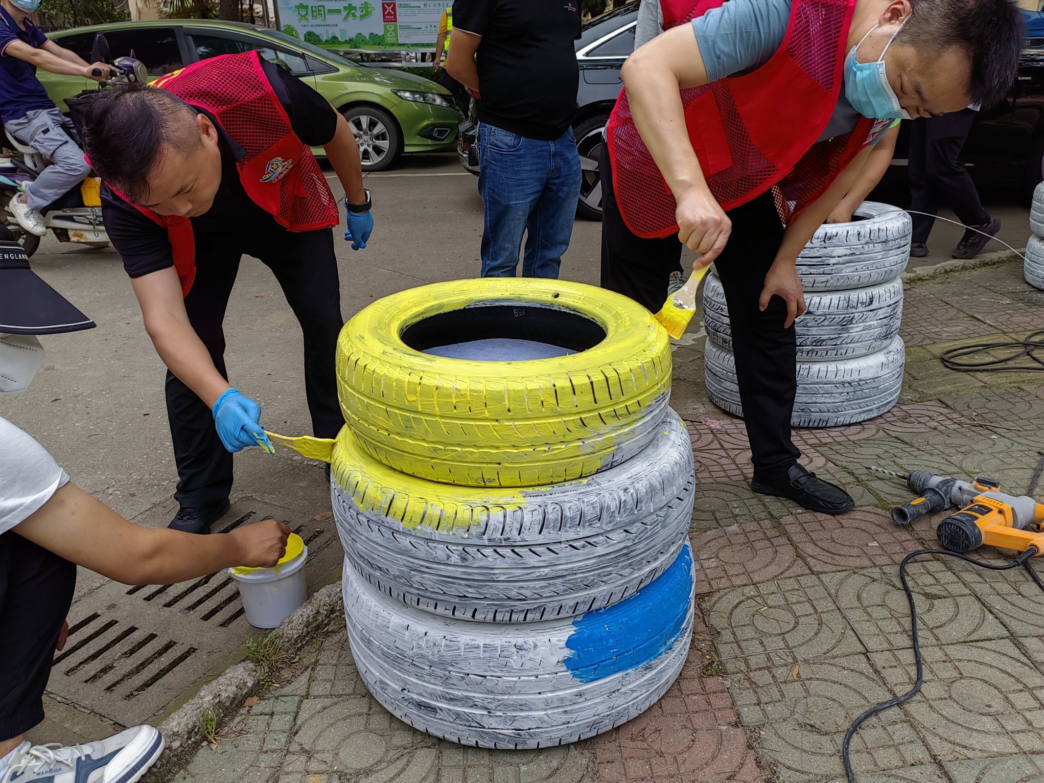 志愿者们结合区域布局,给轮胎定位,开始创作,为轮胎画上生动可爱的小动物、呆萌有趣的卡通人物和多彩多姿的植物图案。经过几个小时的努力,一幅幅颜色鲜明、富有童趣的作品出现在大家的眼前。废旧的轮胎在能工巧匠们的手中重新穿上了新衣,承担起美化社区环境的“新”使命。大家齐心协力把场地整理干净,将旧座椅、旧宣传栏一并翻新。