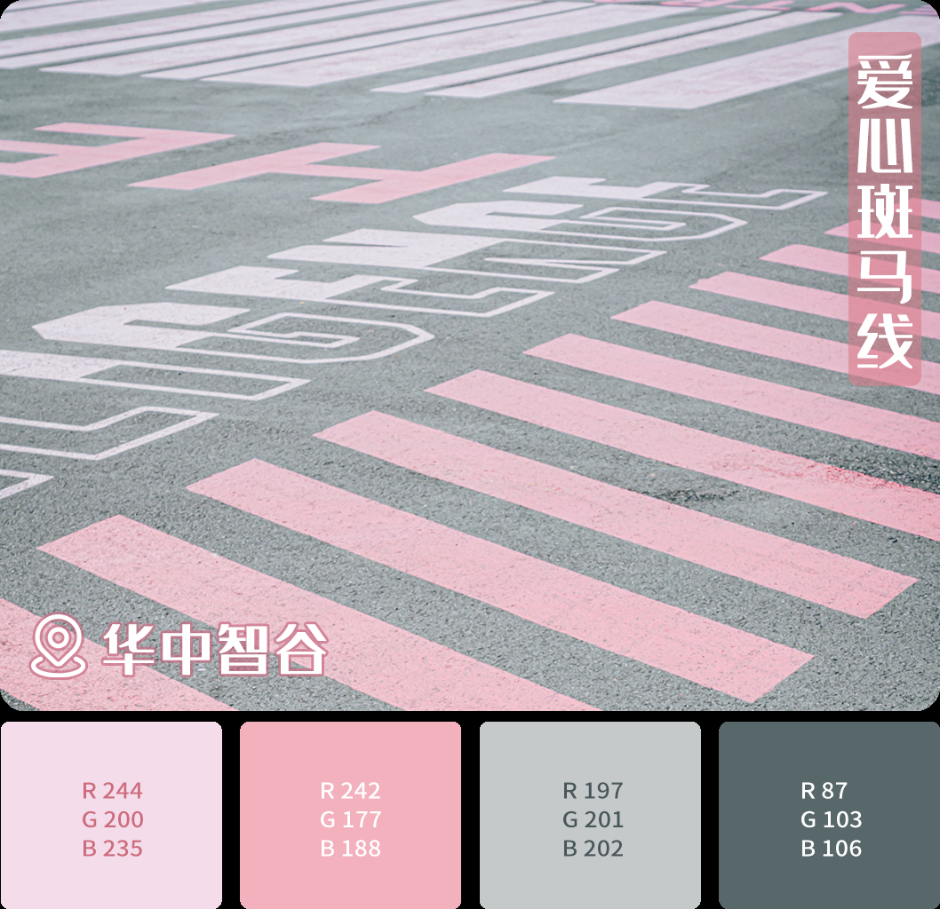 在社交网络上刷屏的粉色斑马线就在华中智谷,粉色的斑马线与超大颗的爱心真的浪漫值拉满,瞬间感觉空气里全是粉红泡泡。
