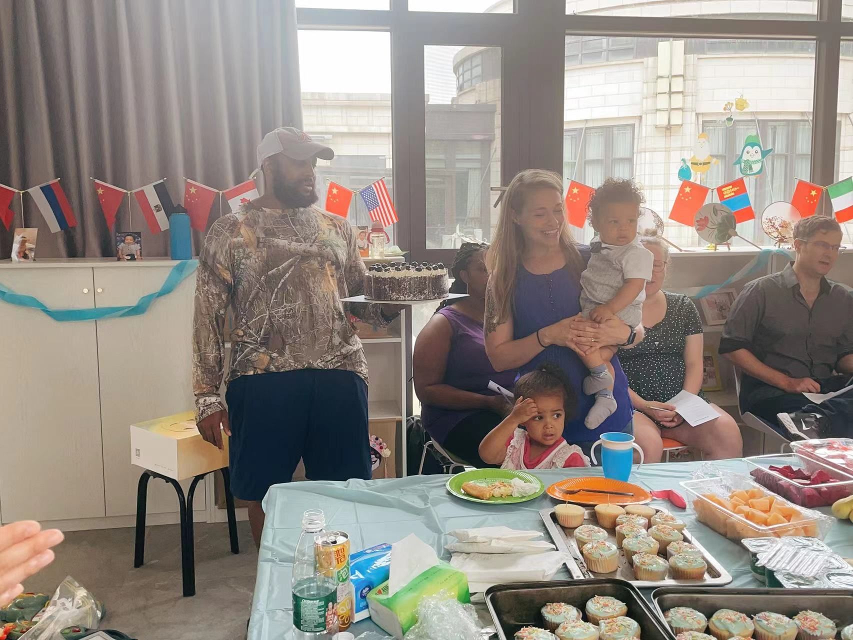 车谷融媒6月6日讯 6月3日是外籍居民Jonathanp Hillipallen的孩子Allen的一岁生日。沌阳街金域蓝湾社区国际交流中心现场如同一场欢乐的派对,气氛十分热烈。