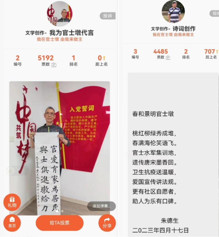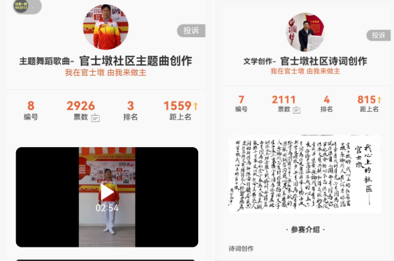 自4月5日发布活动海报启动后,官士墩社区广泛宣传社区历史和发展历程,吸引了30多位社区居民积极参与。参赛作品涵盖社区精神口号、社区主题曲、诗词、书法、手工作品等,其中有80多岁的朱爹爹为社区创作了一首诗、能歌善舞的陈老师为社区创作了主题歌曲、心灵手巧的张阿姨编制了社区手工作品……这些参赛作品内涵丰富,展现了社区人的创意。