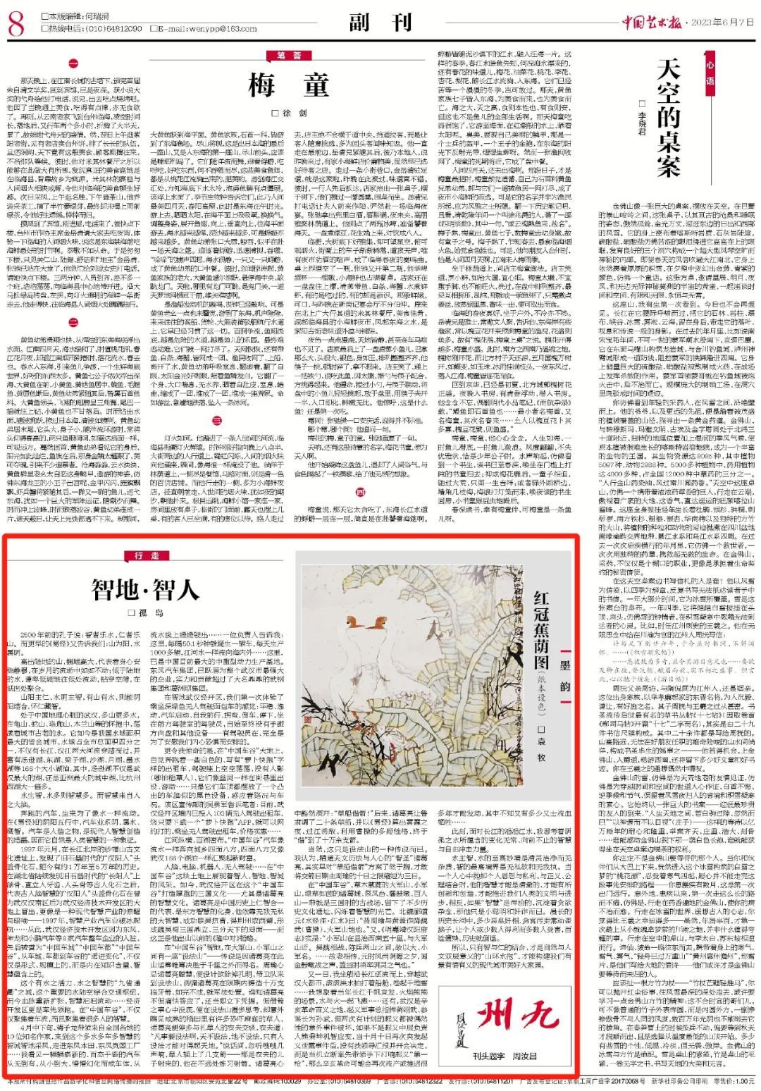4月18日—22日,蒋子龙、叶延滨、王剑冰、王兆胜、李建军、李银昭、孤岛、葛水平、胡竹峰、杨海蒂等10位中国著名作家走进武汉经开区,赏自然风光,品历史古韵,看发展新篇,书车谷胜景 。6月7日,《中国艺术报》刊载作家孤岛署名文章《智地·智人》。以下为全文转载。
