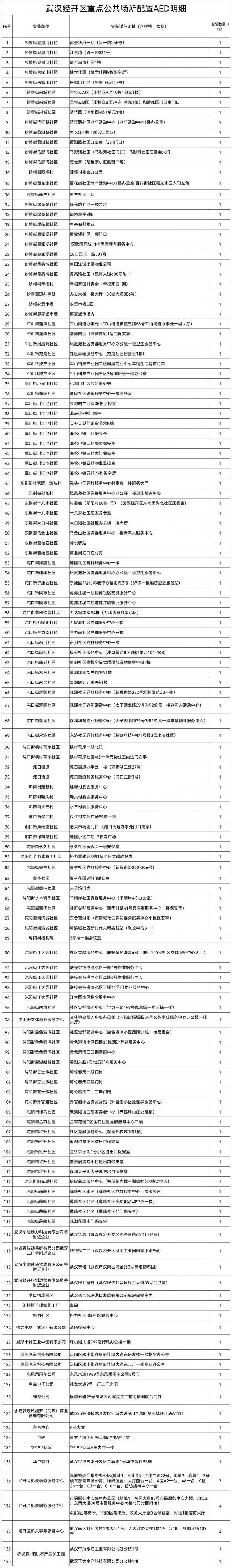 记者从武汉经开区卫生健康局获悉,武汉经开区重点公共场所的自动体外除颤器(AED)首批装设工作已经全部完成,150台AED分布社区、企业、商业区、科技产业园区等公共场所,为市民生命安全增添一份保障。