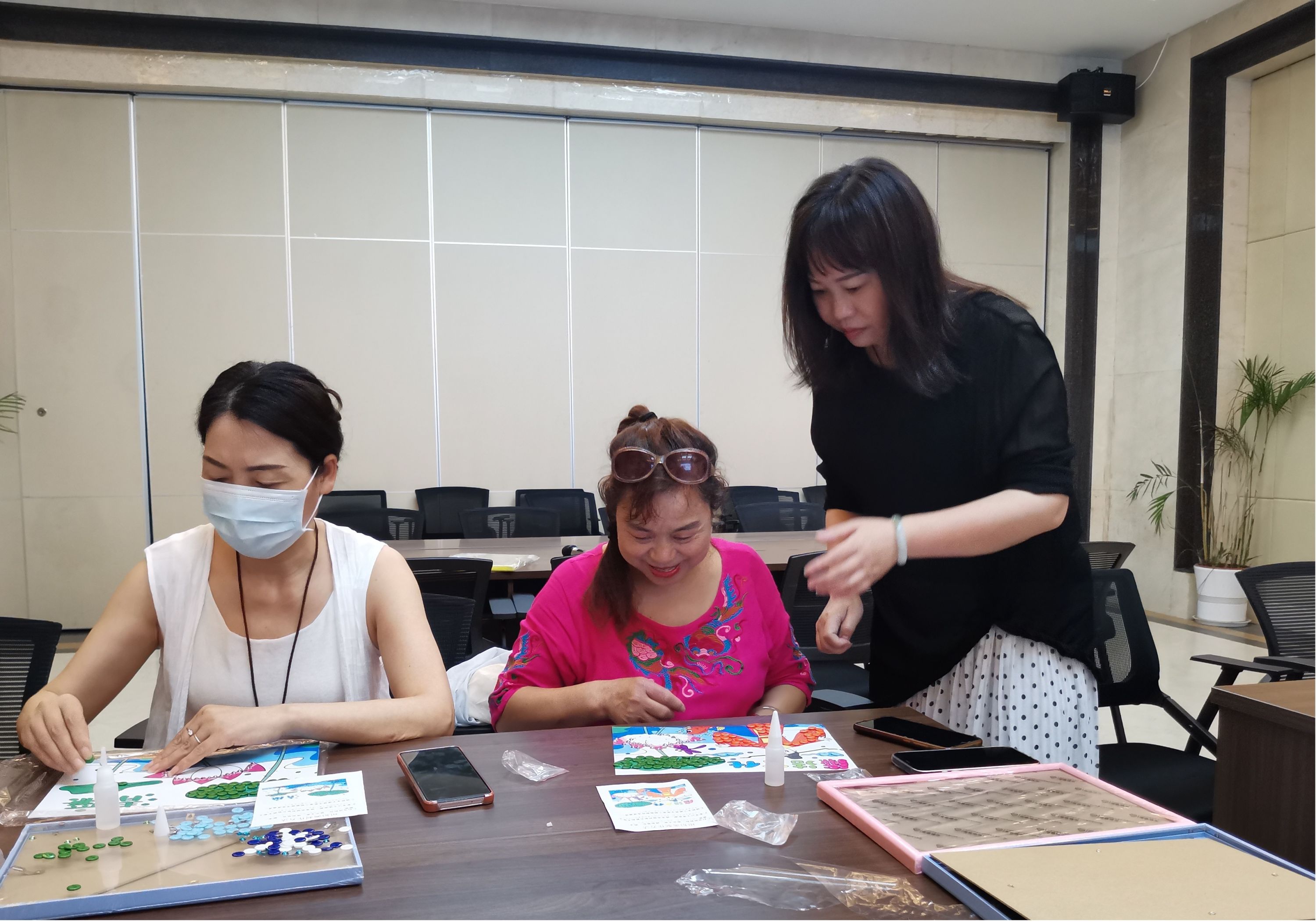 社区工作人员讲解纽扣画制作步骤与要领后,居民分组进行讨论,拟定主题、创意构图、分色拼装、结构加固。大家纷纷秀出作品,分享制作技巧,讲述蕴含意义。