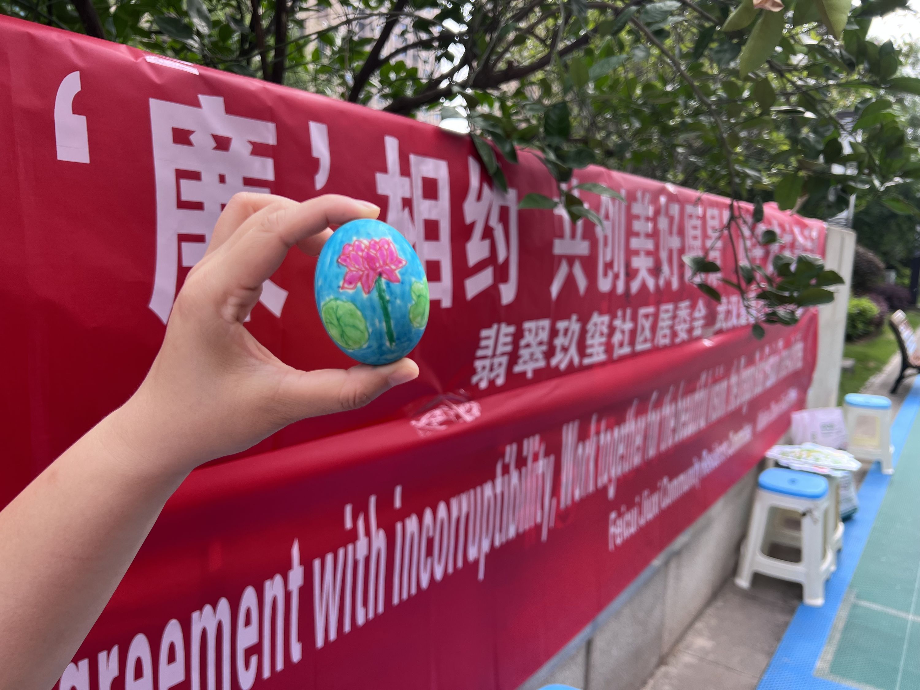 大家一手握蛋,一手勾勒、涂色,用五颜六色的彩笔在一个个鸭蛋上画出了莲花、青竹等象征廉洁的事物,并写上廉洁警句,诠释各自对廉洁的理解。不少居民表示,要将这颗“廉洁蛋”带回家,也让家人感受廉洁之风。