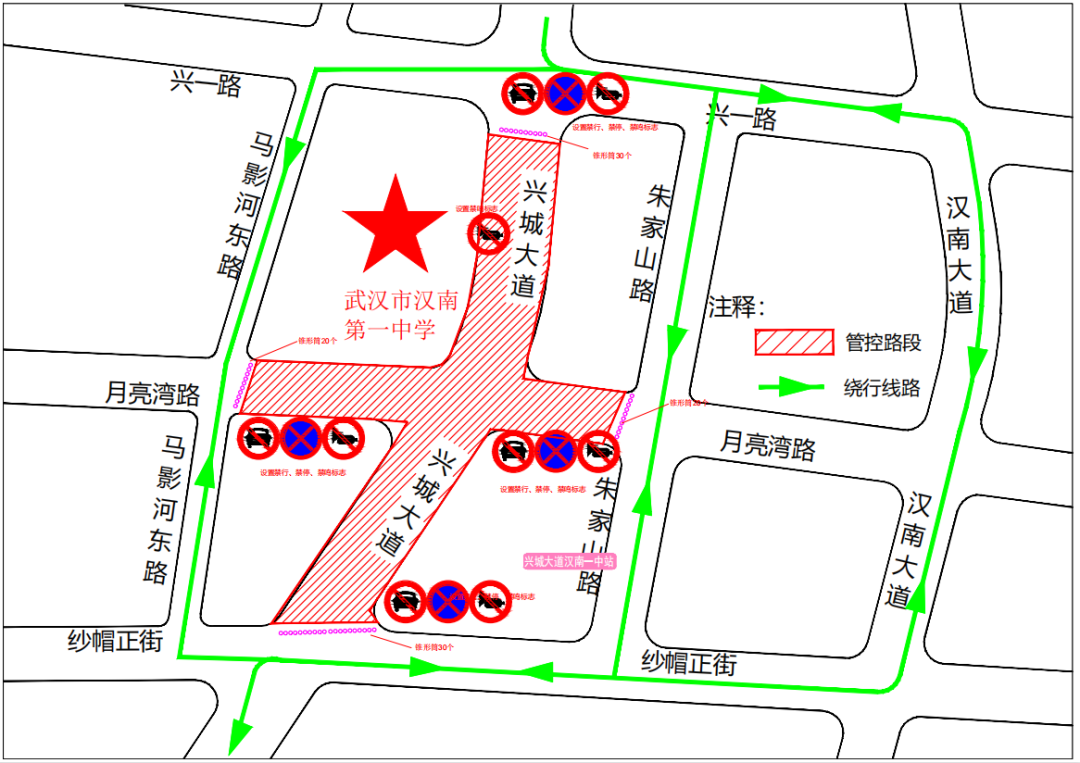 (2)月亮湾路(马影河东路至朱家山路)路段:实行交通管制,禁止车辆驶入兴城大道(工作车辆除外)。