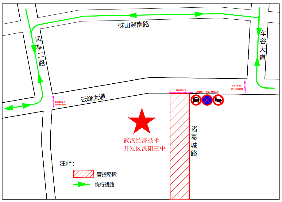 (2)英语听力考试时间段时,封闭云峰大道(车谷大道至凤亭二路)路段,请车辆注意绕行其他路段行驶。