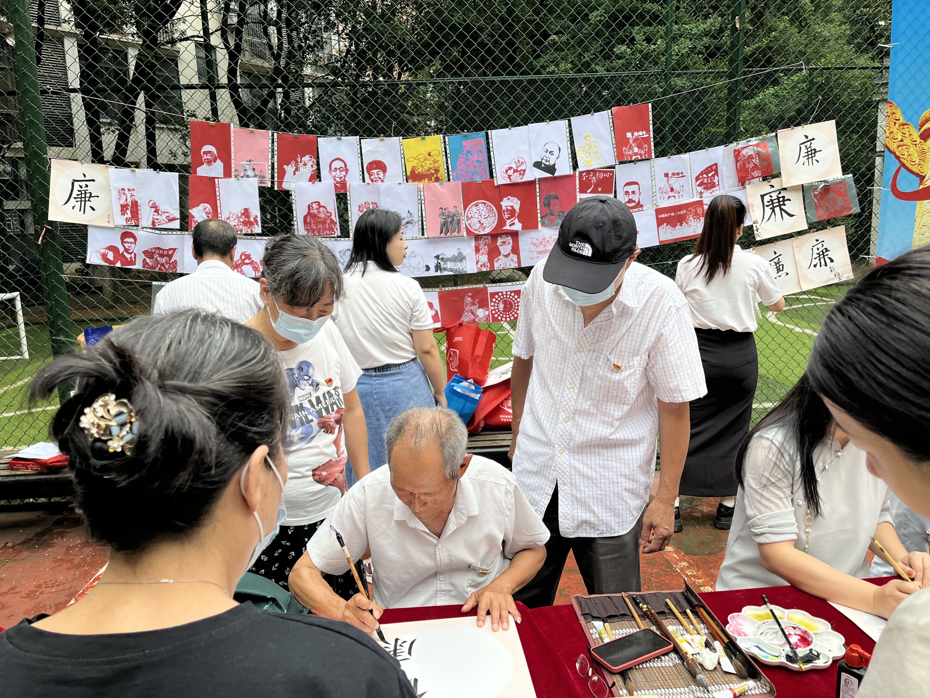 现场,社区党员们不仅欣赏到传统手工剪纸,而且还跟着老党员画“廉”字。水以清为贵,人以廉为尊,社区老党员们手把手教授年轻党员剪“莲”花,写“廉”字,将廉洁文化深植于心。