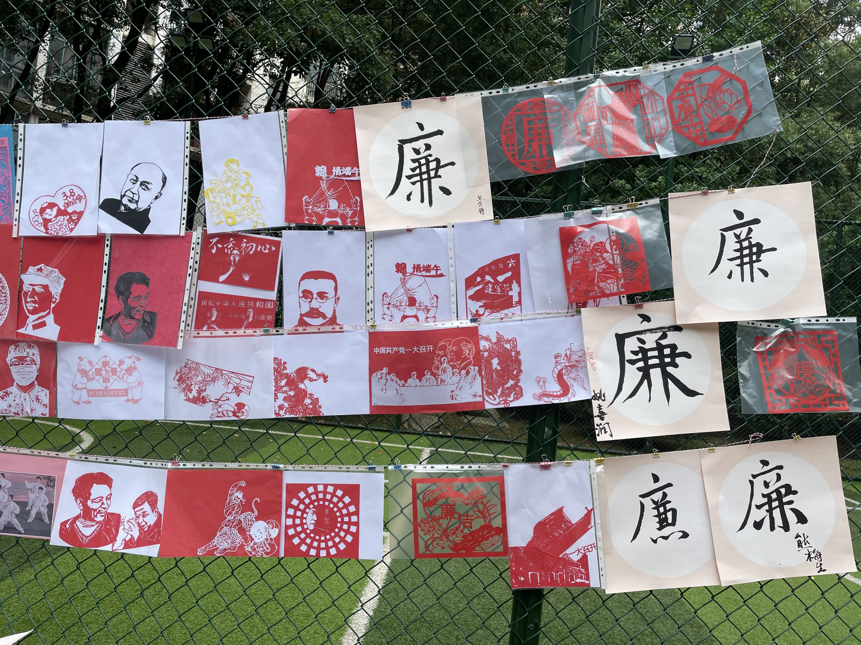 剪纸是中国民间艺术中的瑰宝,寓意很广。社区老党员曹成德剪出与廉字谐音的“莲”花,展现和荷花一样出淤泥而不染,清正廉洁的高尚品德。所有的剪纸作品中间都刻有“廉”字,周围围绕着有着和平、美好、高洁、清正、幸福寓意的金鱼、竹子、荷花。