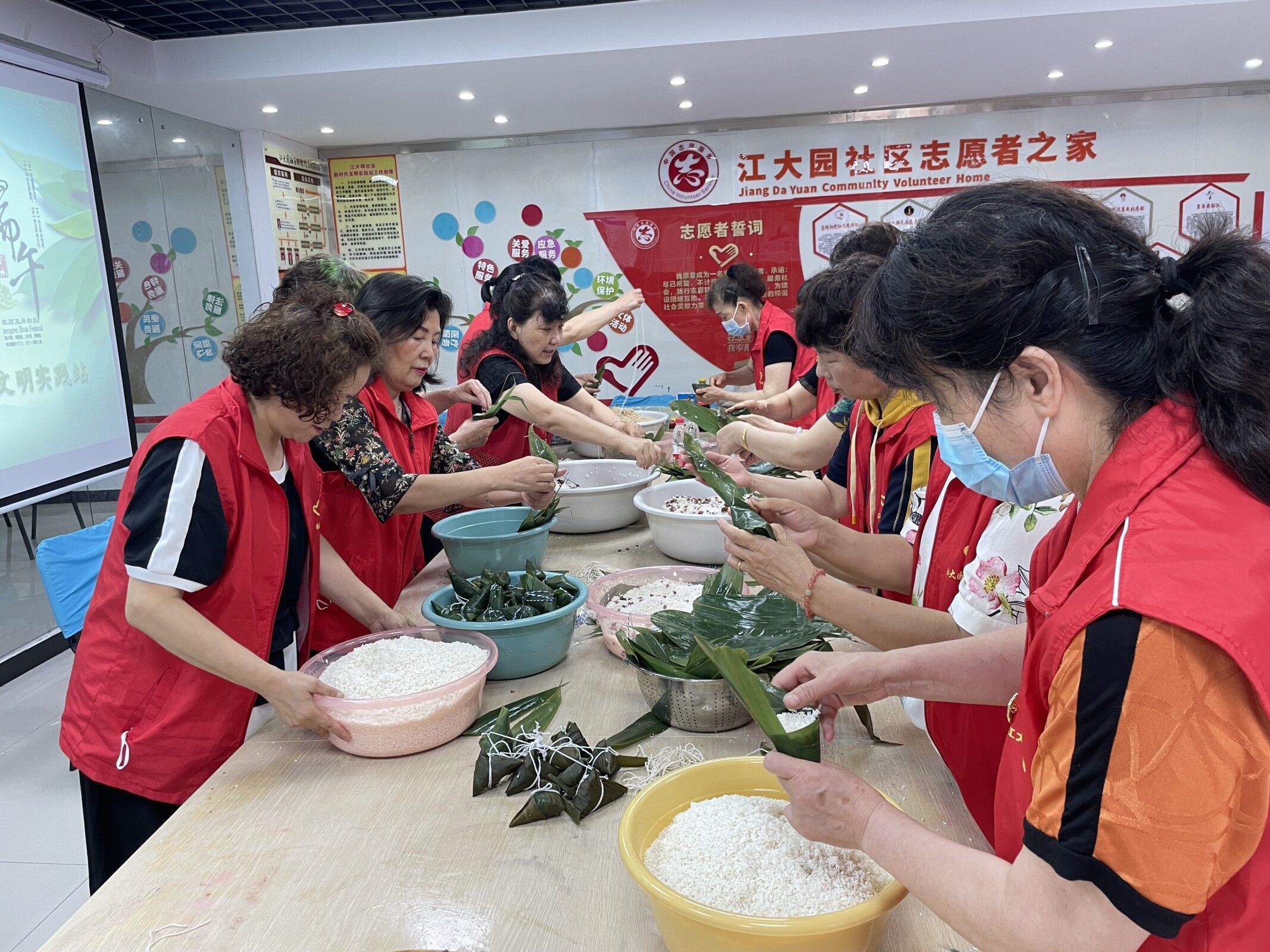 活动现场,社区党员、志愿者们带领辖区居民齐动手,拿粽叶、卷漏斗状、填糯米、塞馅料、压紧实、捆绑……整个过程一气呵成。一片片清香的粽叶、一粒粒晶莹的糯米,在一双双巧手下,变成一个个形态各异的粽子,现场一片欢声笑语。