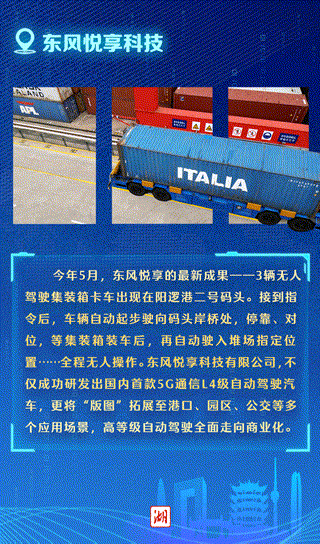 “这批无人集卡,搭载了30多个全感知传感器部件,通过5G网络通信定位,能实时接收并精准执行运输指令,并根据周边环境自动做出微调、避让等动作。”东风悦享项目部工程师郭彬介绍。未来,它们还将驶进中远海运在全球的37个港口,助力打造面向未来的智慧港口。