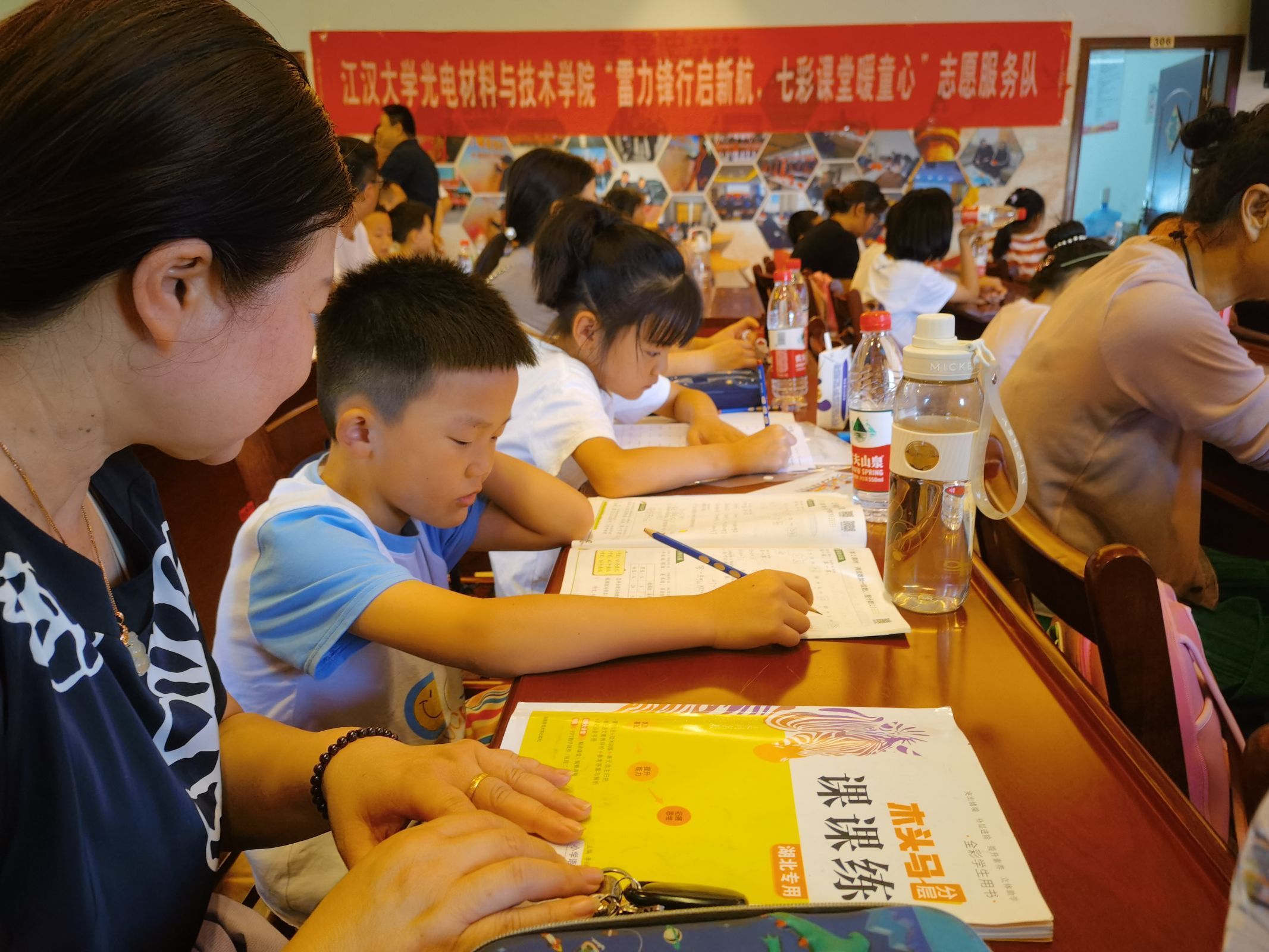 共建单位江汉大学光电材料与技术学院党委书记沈博介绍,本次暑期托管班志愿服务队以雷锋精神研究会为核心,集合阳光青年志愿者协会、云里物理社、手工制作社、Square滑板社等多所特色社团力量,成员涵括学校十余个专业,跨专业合作,提供多角度服务,希望在这个“七彩假期”,关爱和教育的阳光,照亮他们的每一天。