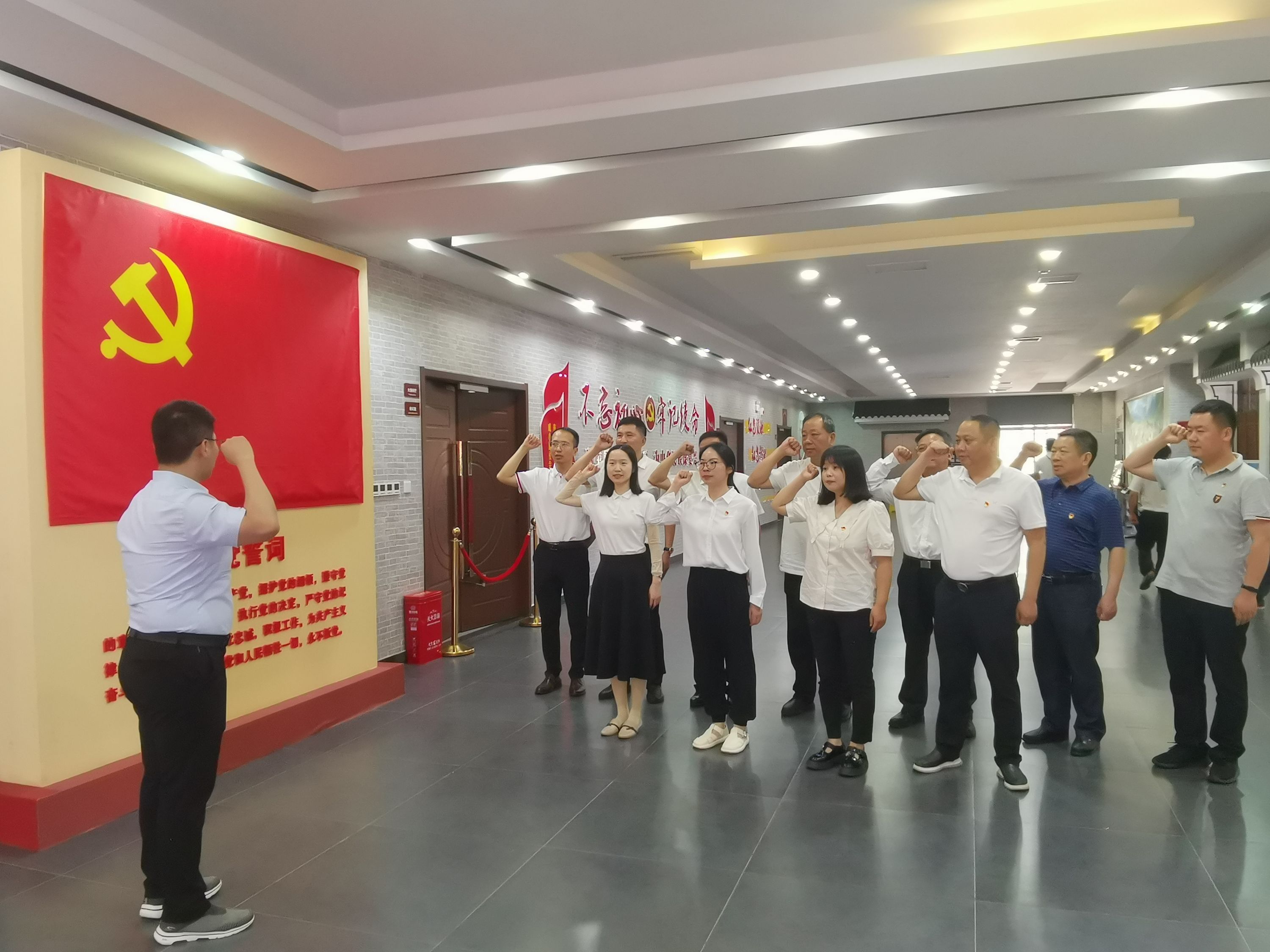 在新四军第五师历史陈列馆,全体党员在党旗下重温入党誓词,表达对党的无限忠诚和为党的事业奋斗终身的坚定信念。