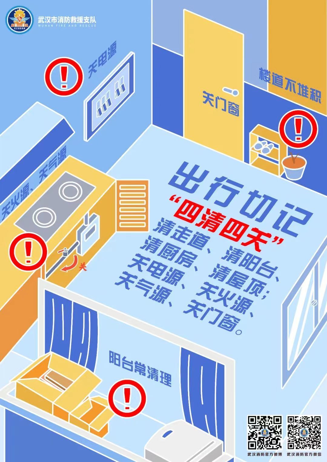 六、居家生活,请做好“四清四关”(清阳台、清厨房、清走道、清屋顶;关气源、关火源、关电源、关门窗),及时清理阳台、楼道杂物和易燃可燃物品,定期清洁厨房油烟管道和灶具;厨房用火不离人,在出门前或长期不用电器、燃气时,应及时将电源和燃气关闭。