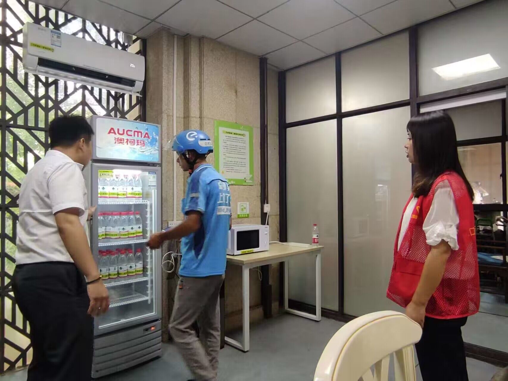 车谷融媒7月16日讯 7月13日,沌口街道翡翠玖玺社区联合万科物业服务中心打造的公益温馨驿站正式开放,为户外劳动者提供夏纳凉、冬取暖、歇脚小憩、交友畅聊的固定场所,让新业态就业群体更好地感受到城市的温度。