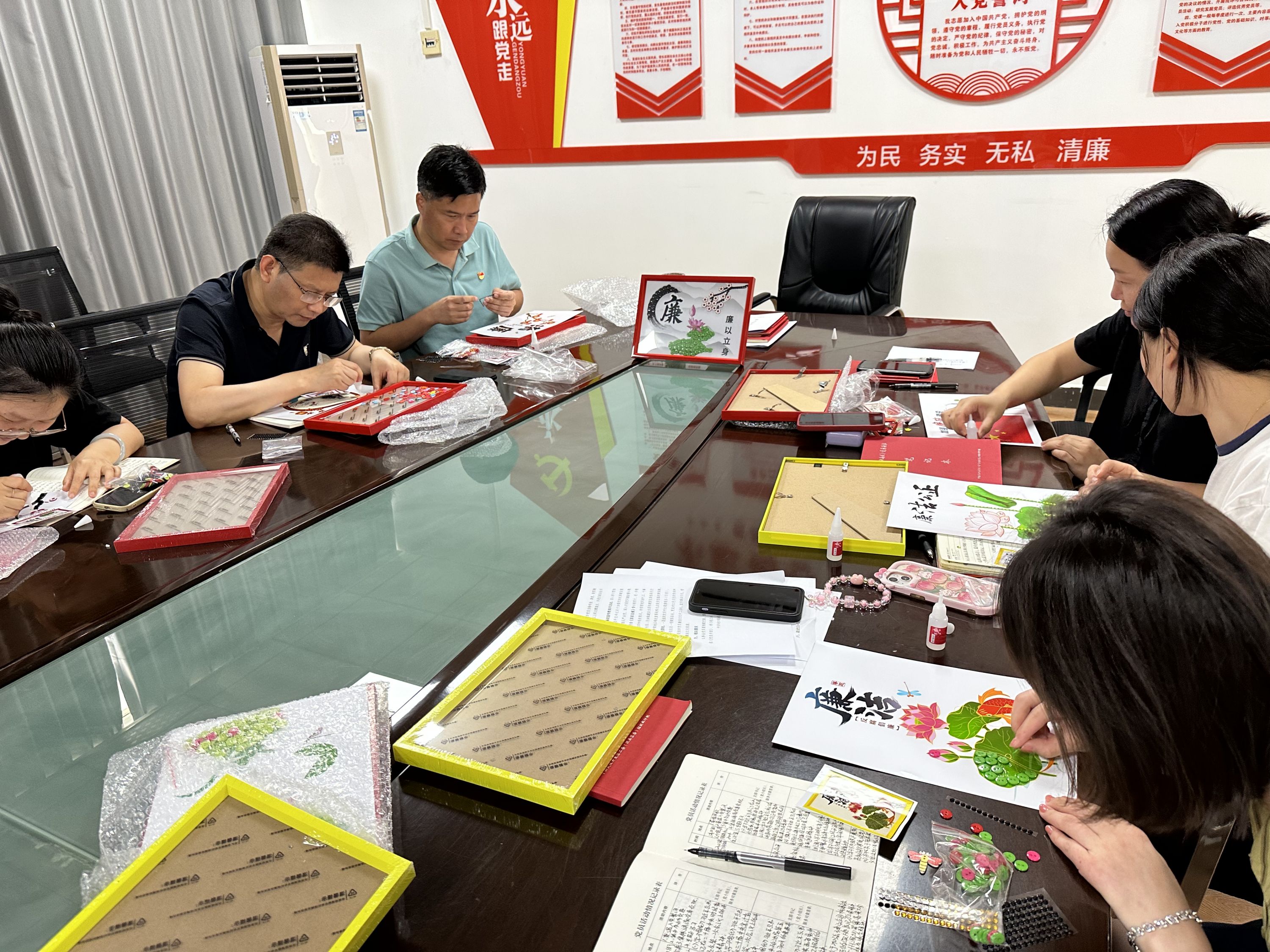 “你看我的荷花粘的好看吗?”“我要把这个字粘的显眼一些。”党员们在你一言我一语开始制作纽扣画。一张画纸,一瓶胶水、一把剪刀、一袋纽扣,大家通过手工贴纽扣画的方式,制作出荷花、荷叶等元素,汇聚成一幅幅精美的廉政作品。“我要把这幅纽扣画摆在办公桌上,时刻提醒自己廉洁公正。”支部纪检委员说道。