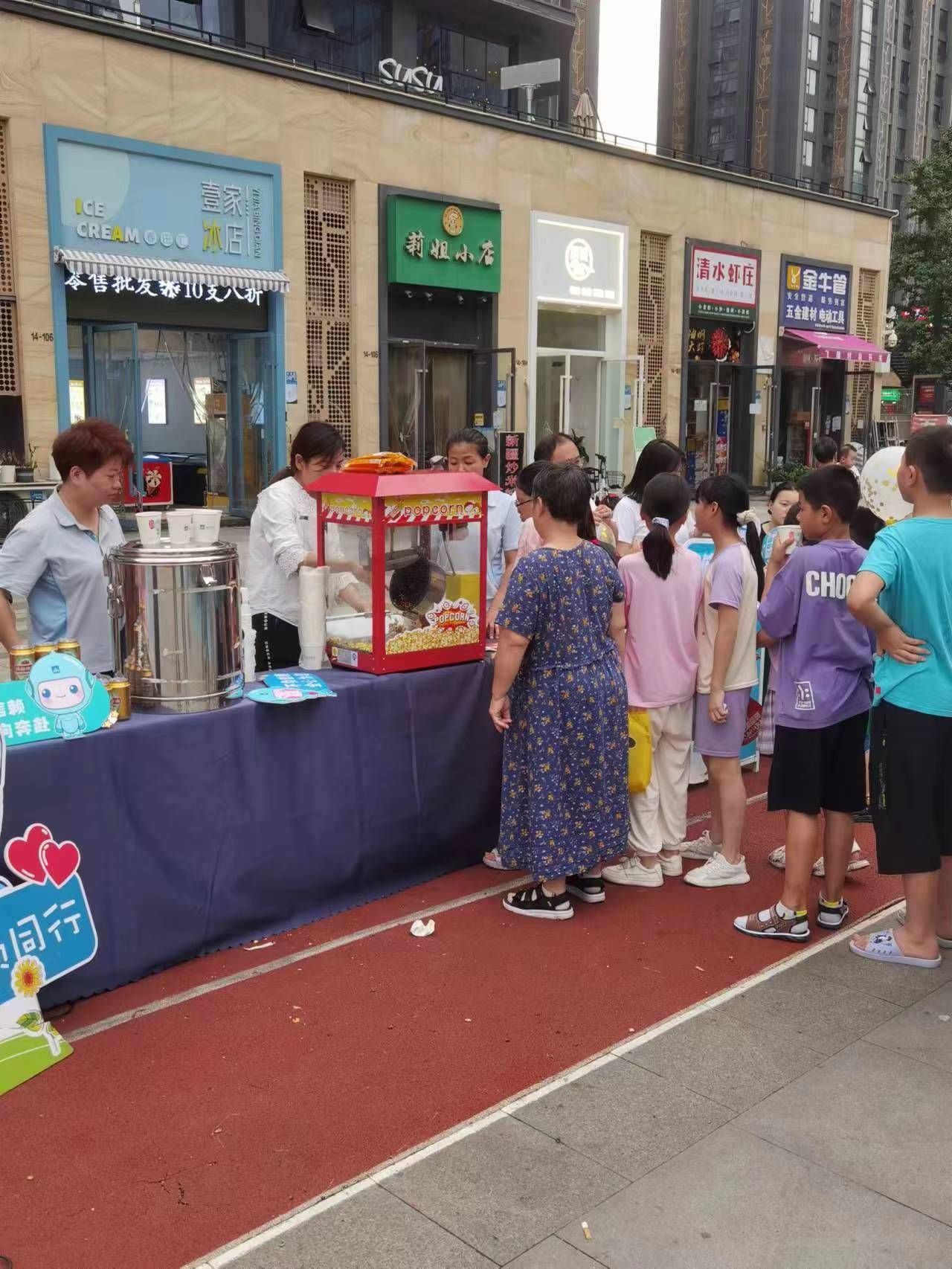 此次选定的影片是小朋友们最爱的动画片《哆啦A梦:伴我同行》,随着天色变暗,光影闪烁,放映机犹如时光穿梭机,带领大家一起回到儿时的旧时光。商铺还免费提供爆米花、酸梅汤、啤酒等美食,让大家在美食的陪伴下沉浸式体现电影的浪漫。