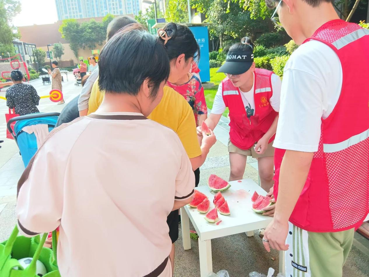 活动现场设有便民摊位互动区域,居民们可以免费品尝美食,体验小猫钓鱼、互动橄榄球等游戏,还可以参加口腔检查、鞋衣清洁等服务。尽管烈日炎炎,但来往居民与志愿者热度未减,志愿者把西瓜送到居民手中,居民尽情感受夏日的清凉。