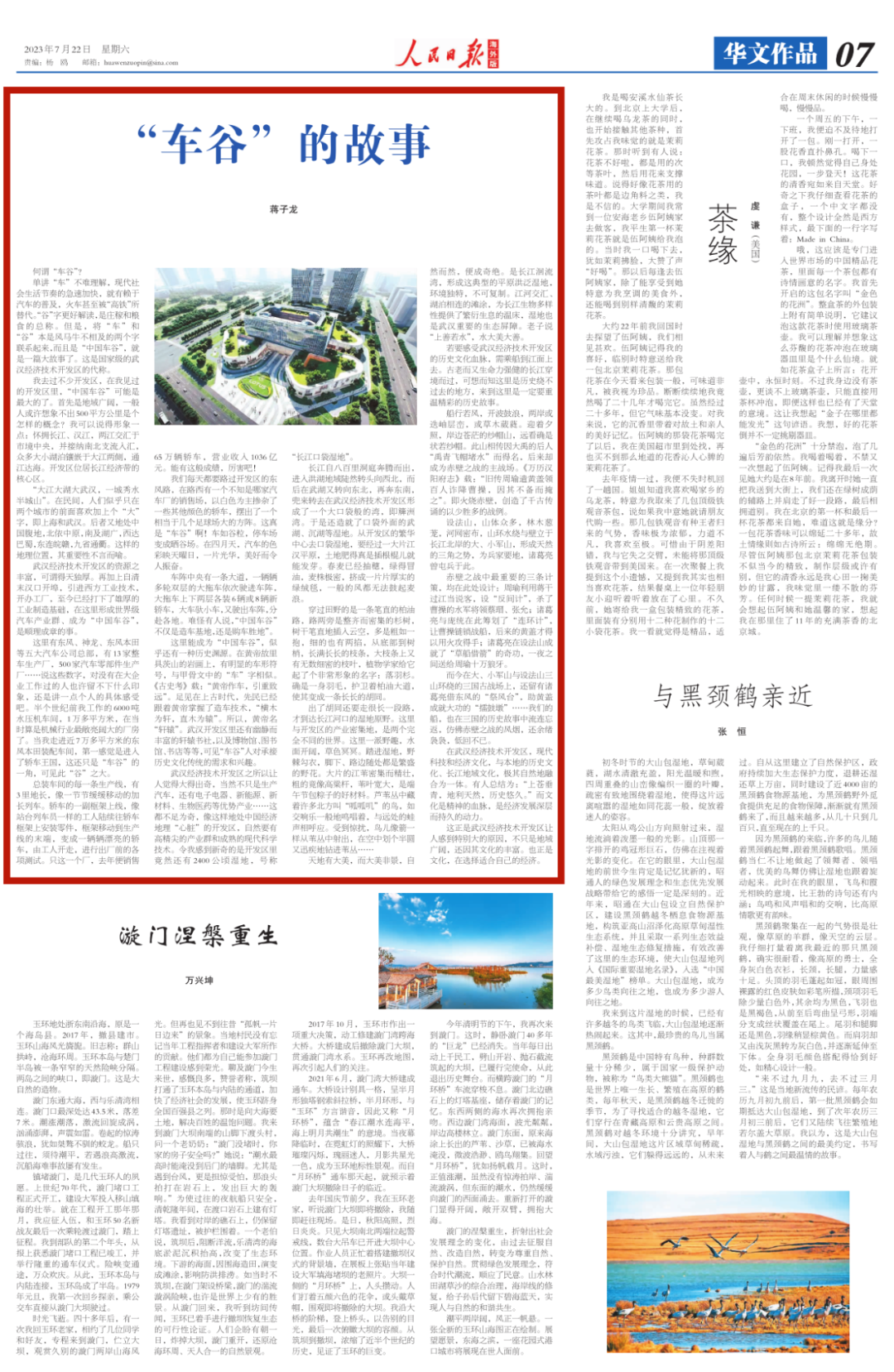 4月18日—22日,蒋子龙、叶延滨、王剑冰、王兆胜、李建军、李银昭、孤岛、葛水平、胡竹峰、杨海蒂等10位中国著名作家走进武汉经开区,赏自然风光,品历史古韵,看发展新篇,书车谷胜景 。7月22日,《人民日报海外版》刊发作家蒋子龙署名文章《“车谷”的故事》。以下为全文转载。