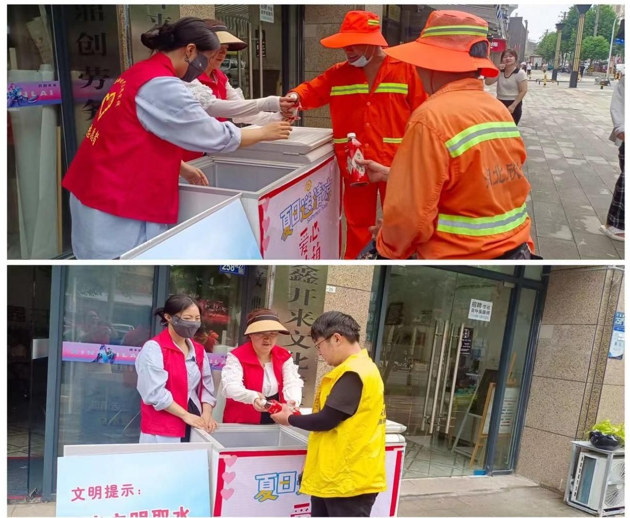 “天气热,请您喝瓶水!”在圣特立小区周边商铺门口,身穿红色爱心马甲的社区志愿者们将一瓶瓶饮用水、酸梅汤送到过路快递员、外卖小哥、环卫工人、建筑工人等户外高温工作者手中,为他们带去夏日中的一丝“清凉”。
