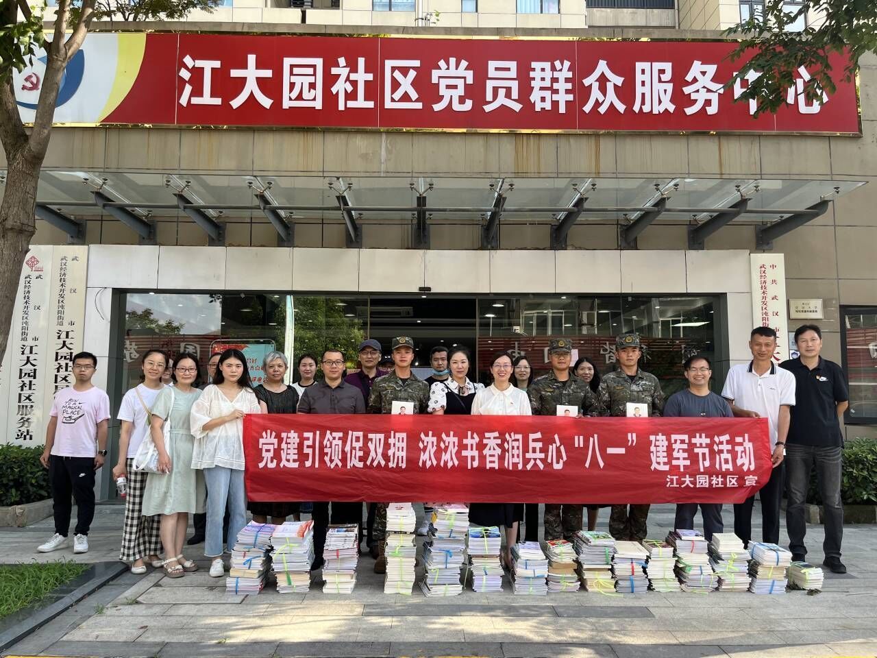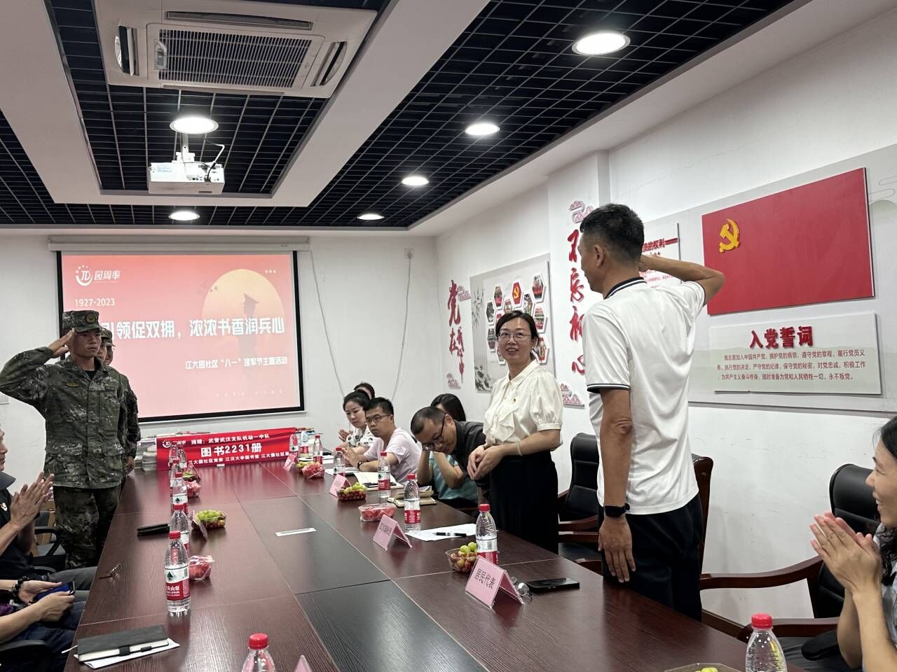 车谷融媒7月24日讯 7月21日下午,沌阳街道江大园社区开展“党建引领促双拥 浓浓书香润兵心”八一建军节活动。驻地武警部队、江汉大学图书馆、街道退役军人服务站、鸿海保利等单位及社区居民群众代表参加此次活动。