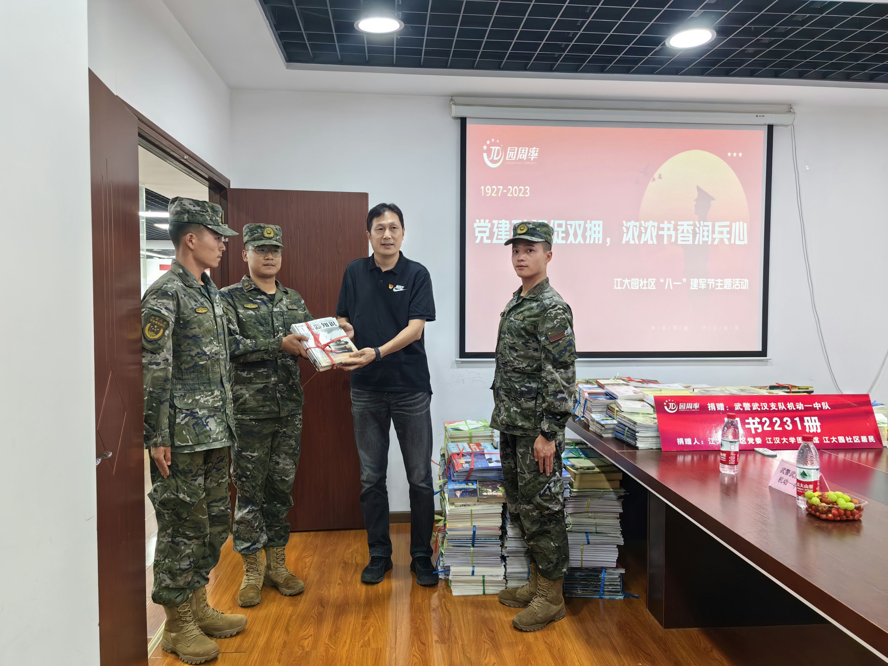 在捐书仪式上,江汉大学图书馆沈红兵馆长为武警官兵捐赠包括党史党章、文学杂志、图书等各类图书,希望丰富官兵的业余文化生活。