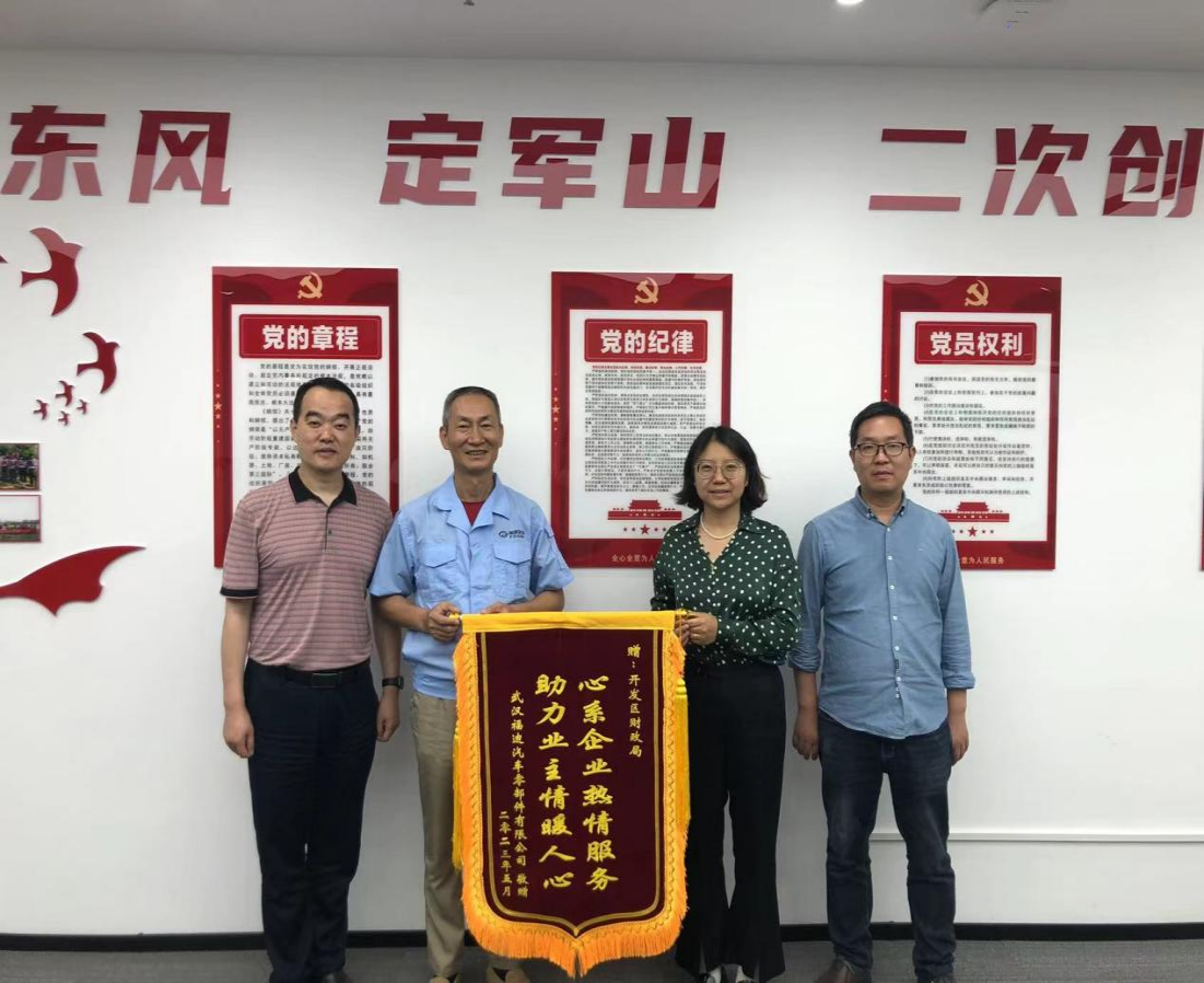今年4月,武汉福迪汽车零部件有限公司急需新建一条电力线路保障项目投产。为加快工作进度,区财政局经建科相关工作人员利用午休时间完成了所有环节的审核。事后,武汉福迪项目负责人专程赶到区财政局,将一面印有“心系企业热情服务,助力业主情暖人心”的锦旗送到区财政局。