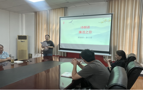 支部党员彭兰香朗诵诗歌《廉洁之歌》,她用一首首慷慨激昂的诗歌,一句句铿锵有力的话语,讴歌了勤政廉洁的光辉事迹,赞颂党的恩情。