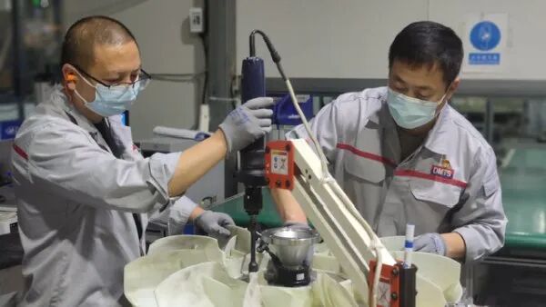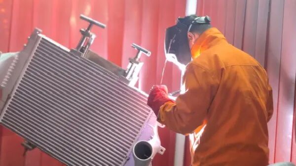 ▲ 在东风马勒的工厂内,工人正戴着面具焊接中冷器。通讯员供图