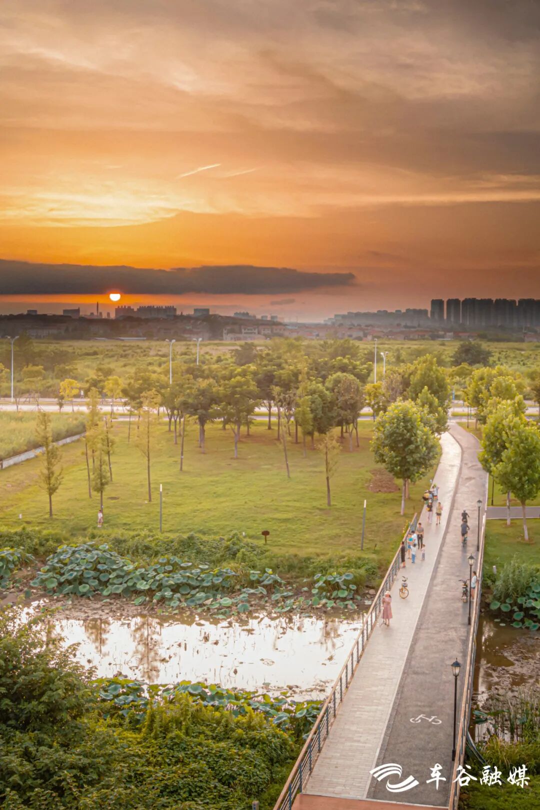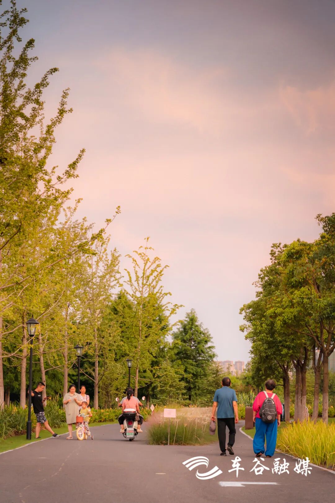 太阳落山,粉紫一片的晚霞映照着地面,晚风徐徐吹来给人们阵阵凉意,这时的三角湖北侧公园便是附近居民首选的休闲场所。