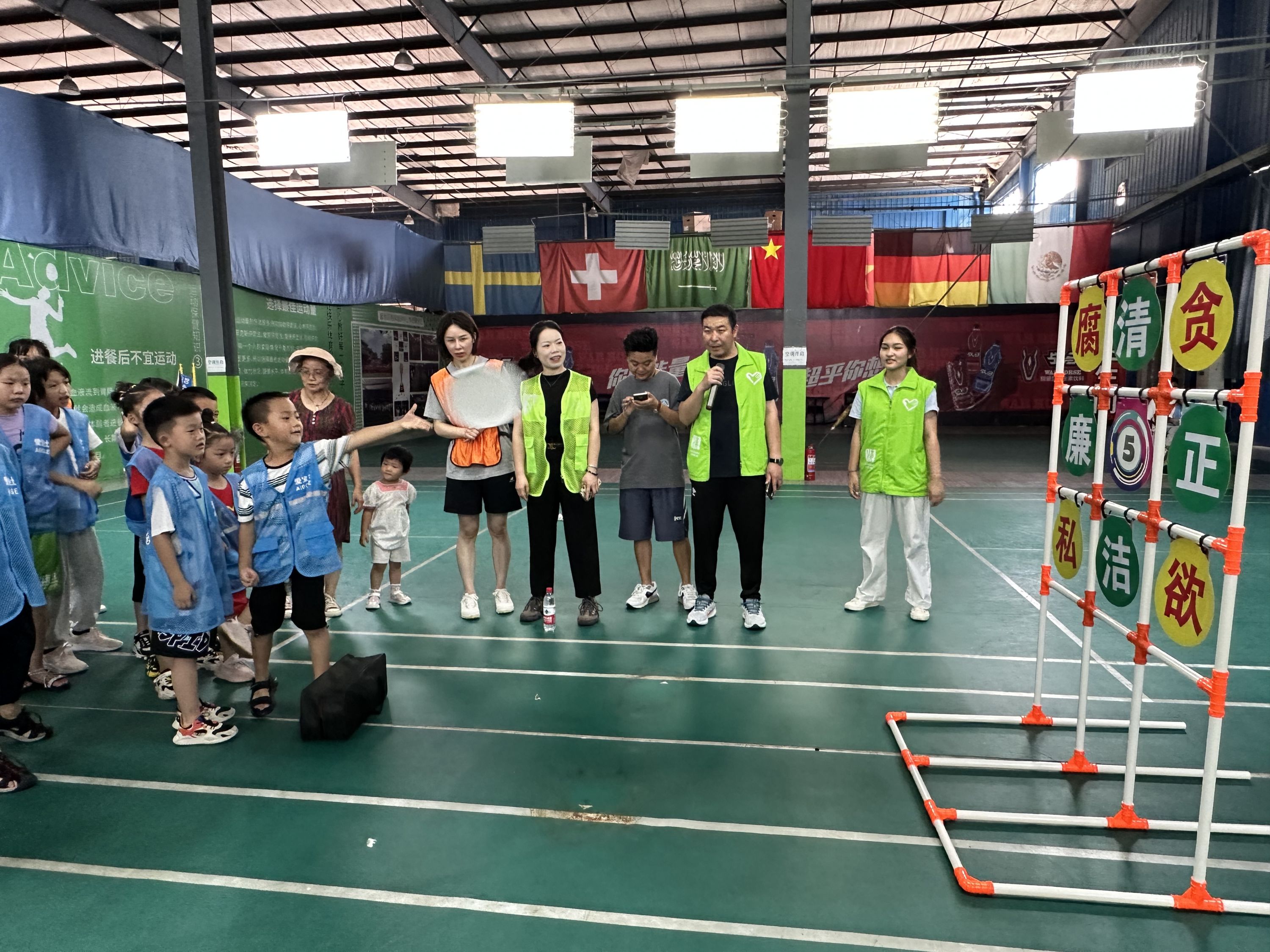 袋鼠蹦蹦跳游戏中,孩子们和家长扮演可爱的袋鼠,跳跃着,象征着追求公正正义。幸福滚滚来游戏中,孩子们和家长站在圆形的布条里,统一步调,欢笑着一起朝前走,传递着快乐和幸福。飞盘射“贪”环节,大家积极踊跃,有的孩子说;“我要射中贪腐。”还有的说“我喜欢清正,要把他们带回家。”打贪鼠游戏中,孩子们分组比拼,用充气锤击打食鼠,象征着打击贪污腐败行为。