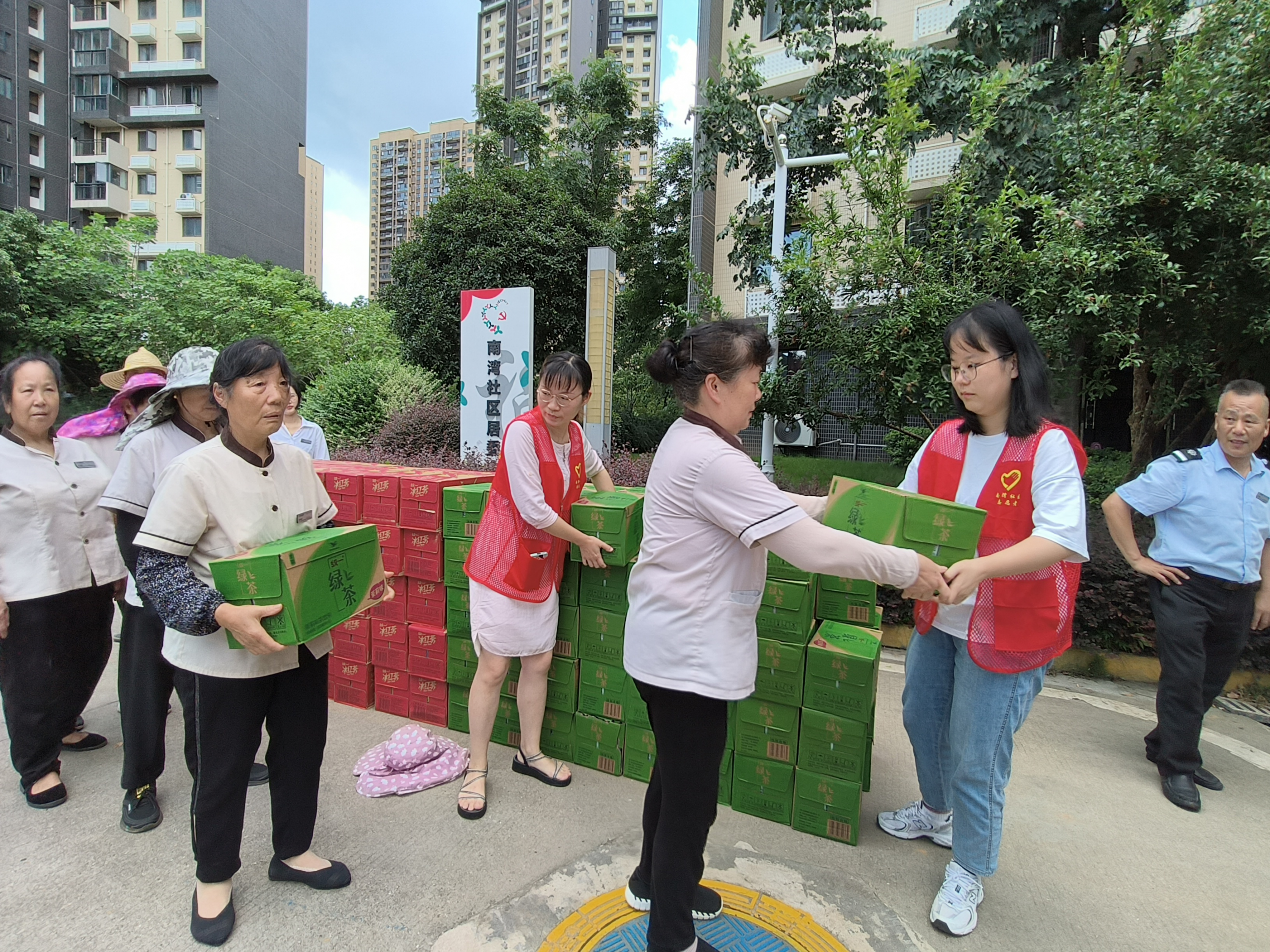 同时,南湾社区工作人员和爱心志愿者为辖区环卫工人等户外高温工作者送去夏日解暑饮品,提醒他们避免长时间阳光暴晒,可以随身携带防中暑药品以备应急,如果出现头晕、恶心等症状应立即休息,情况严重的要立即就医。