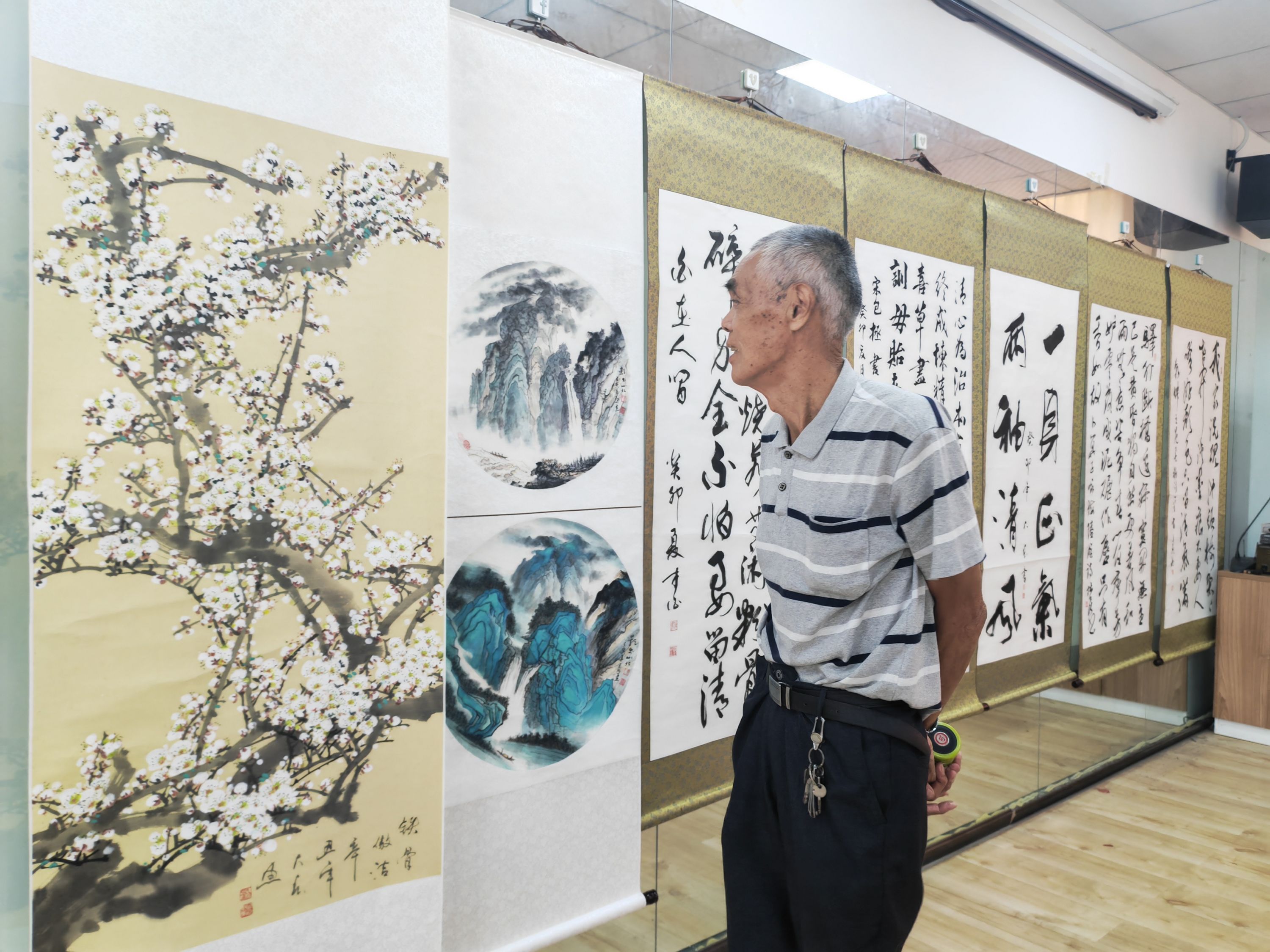 本地书画家创作的清廉作品,吸引社区书画爱好者观摩学习。