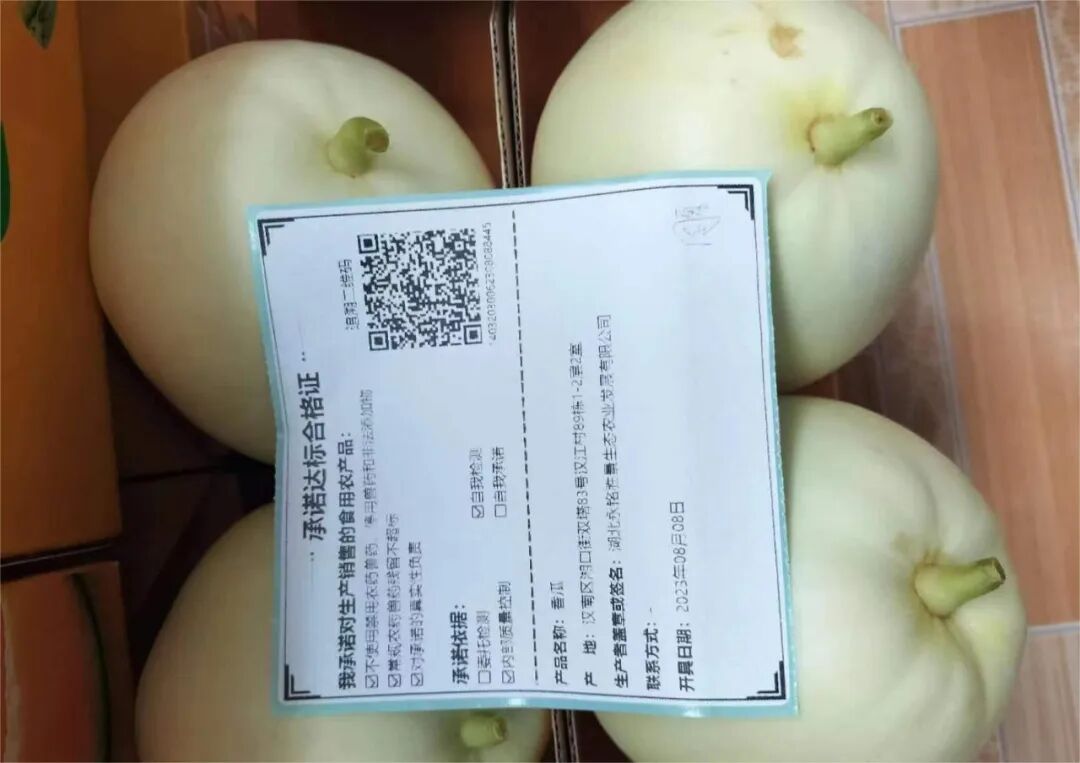 在湘口街湖北永铭胜景生态农业发展有限公司,一箱箱刚从田间地头采摘完的香瓜摆放整齐,箱子上都贴着二维码,上面清晰地标注着该公司的承诺达标合格证。手机扫描二维码,这箱香瓜的产地、检验检查记录等信息映入眼帘。
